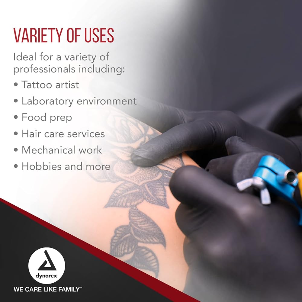 قفازات سوداء لإخفاء البقع: يستخدم رسامي الوشم والمهن الأخرى قفازات النتريل السوداء الطبية التي يمكن التخلص منها لأن لونها الأسود يقلل من ظهور البقع عند العمل بالصبغة أو الحبر أو لون الشعر أو الطلاء مع حماية اليدين بالكامل.