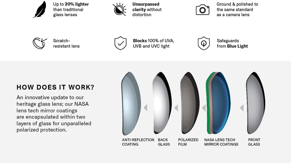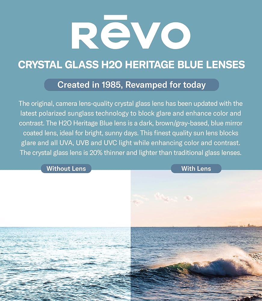 LENS: Revo high-contrast polarized Crystal lenses (Featuring an innovative new process that encapsulates Revo NASA lens technology within two layers of glass) | 8-base lens technology (A more curved profile, temple to temple) | Revo Light Management System (Filters harmful UV, HEV, and Blue Light) | Digital Device-friendly (Reduces glare and enhances clarity of digital screens)