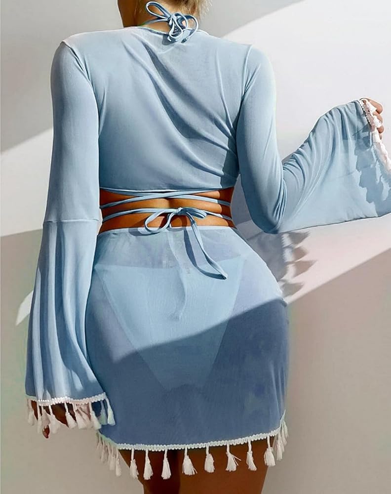 التصميم: رقبة رسن، ظهر متقاطع، حزام قابل للتعديل، حمالة صدر مثلثة، جزء سفلي بيكيني عالي الساق، غطاء علوي بأكمام طويلة وتنورة ملفوفة.