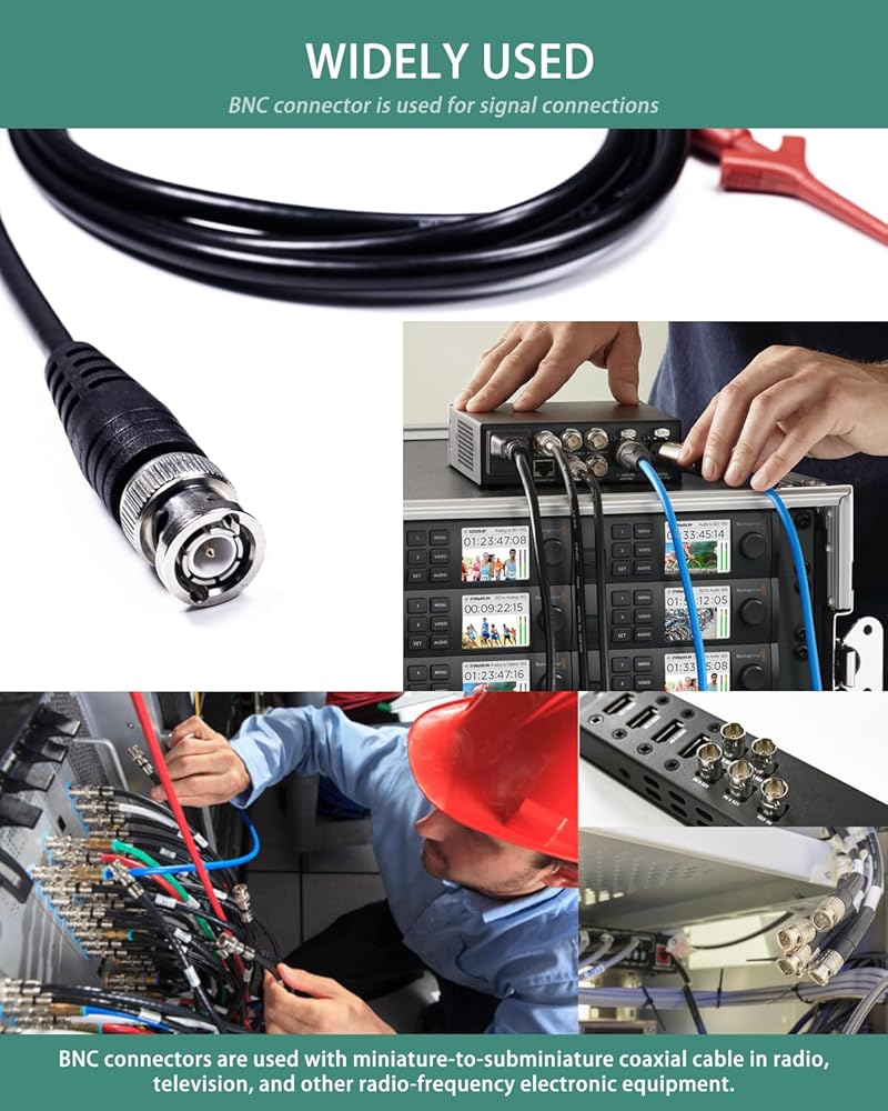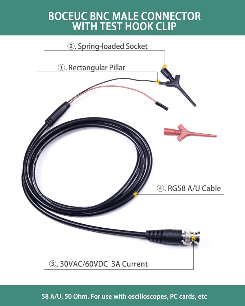 موصلات BNC - يسمح الكابل بالتوصيل البيني بين مقاطع الاختبار وأدوات الاختبار المعتمدة على BNC. نوع الكابل RG 58 A/U، 50 أوم. للاستخدام مع راسمات الذبذبات وبطاقات الكمبيوتر وما إلى ذلك.
