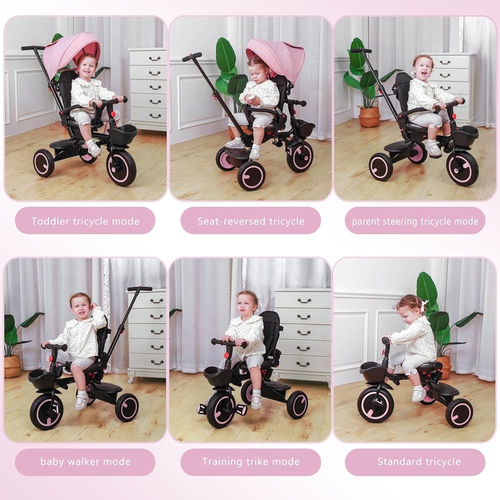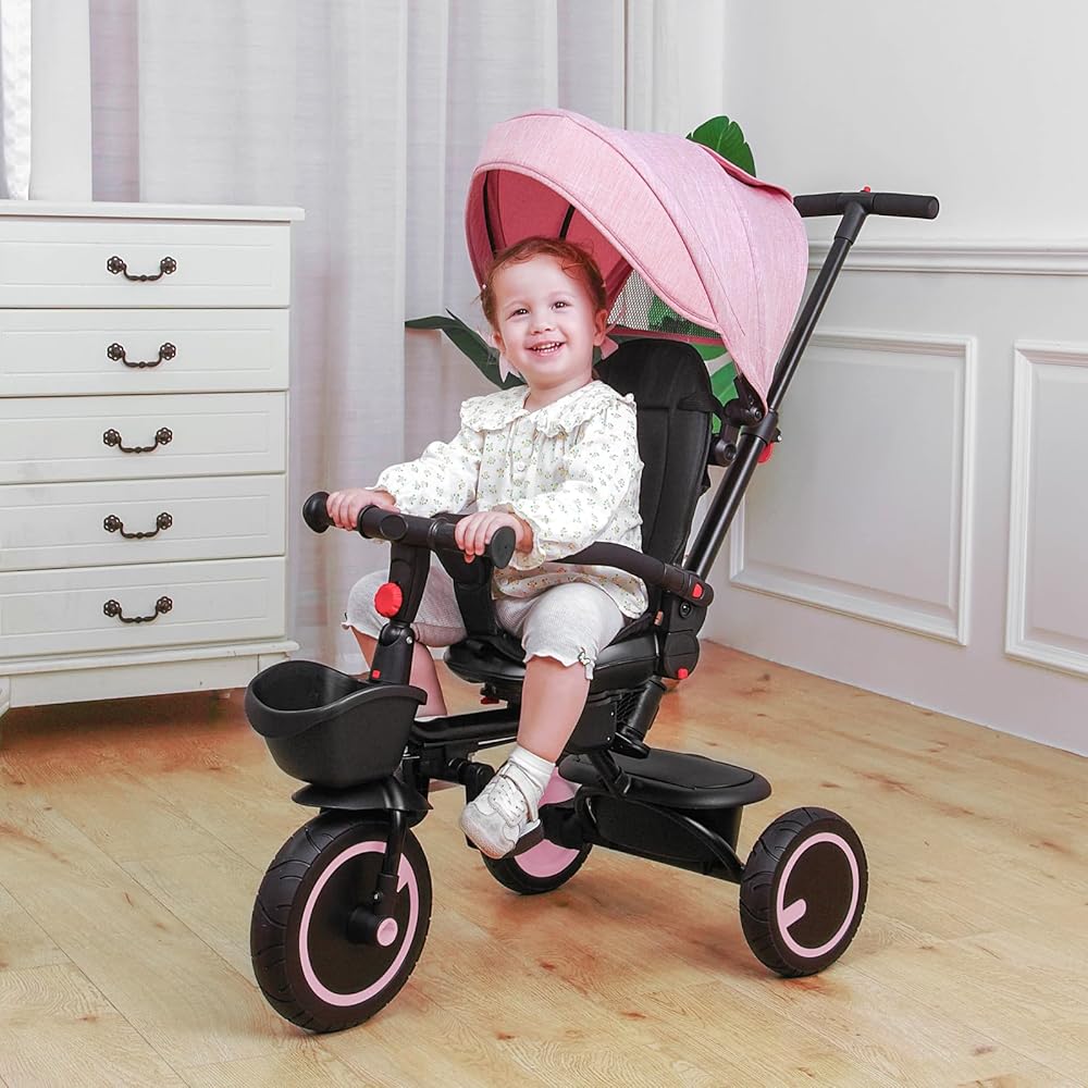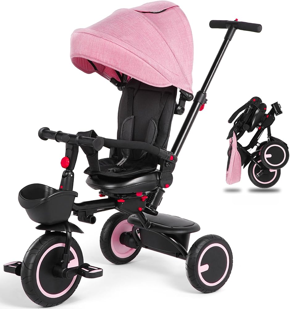 دراجة أطفال ثلاثية العجلات، دراجة أطفال قابلة للطي 6 في 1، دراجة دفع للأطفال الصغار، ألعاب للأولاد والبنات من سن 1 إلى 5 سنوات، دراجة ثلاثية للأطفال مع مقبض دفع، مظلة، مسند ظهر وحزام أمان، هدية دراجة عربة الأطفال للأطفال الصغار