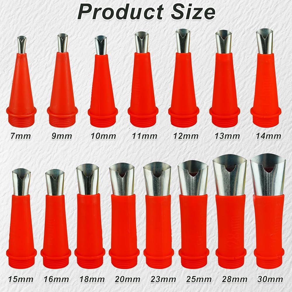 • محتويات العبوة: 18 مقاسًا مختلفًا من فوهات السد 5 مم، 6 مم، 7 مم، 9 مم، 10 مم، 11 مم، 12 مم، 13 مم، 14 مم، 16 مم، 18 مم، 20 مم، 23 مم، 25 مم، 28 مم، 30 مم، و35 مم مع 8 قواعد توصيل و4 أدوات تشذيب مانعة للتسرب، يمكن أن تلبي حشوتك المختلفة