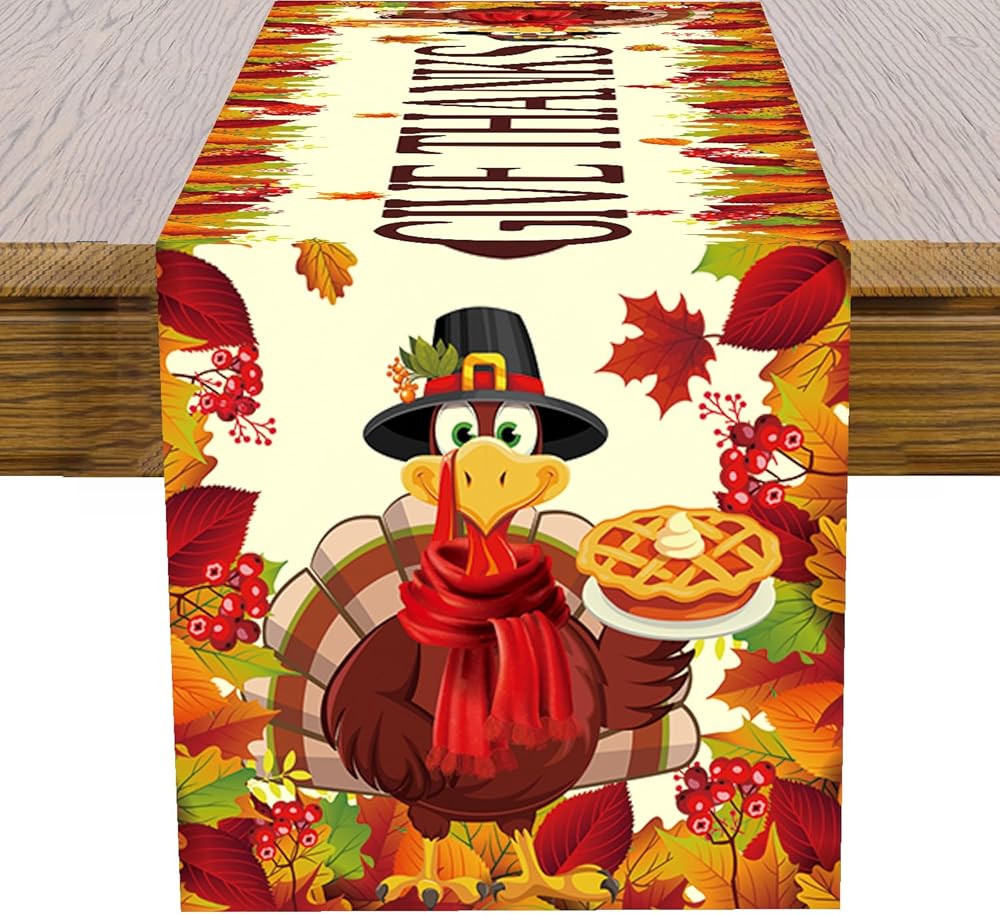 Extra Large Thanksgiving Table Runner - Thanksgiving table runner with turkey, fall leaves and Thanksgiving signs, it is full of fall Thanksgiving party atmosphere, which is great for your Thanksgiving party decorations.
