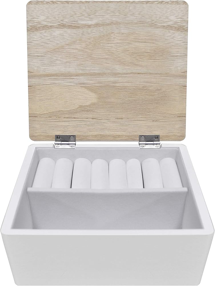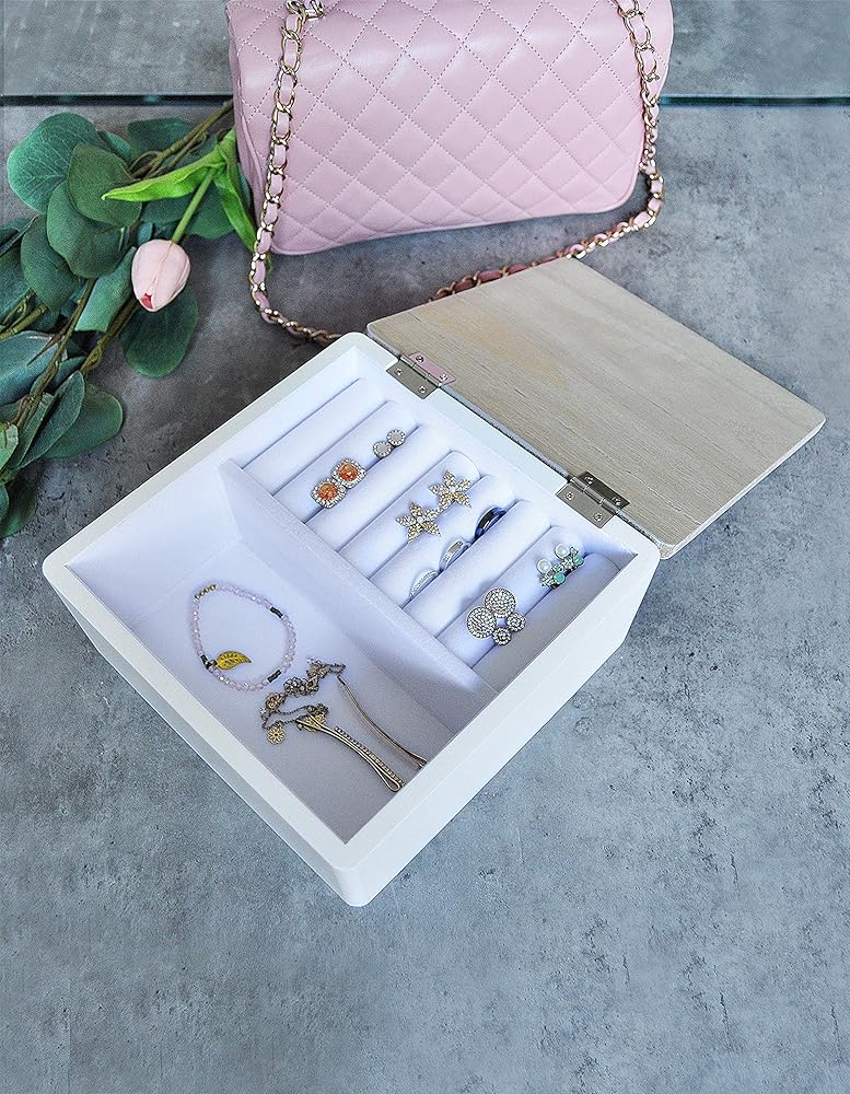 Bring a modern farmhouse aesthetic to your home and bedroom décor with this Beautiful White Jewelry Box with Lid by Rae Dunn. Featuring sturdy wood craftsmanship and an elegant white painted exterior, this beautiful box will look fabulous as an adornment on your vanity, dresser, shelf or nightstand.
