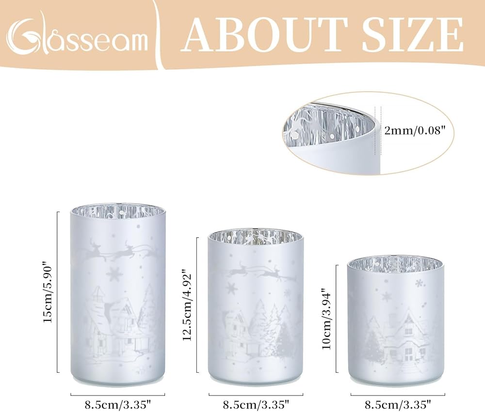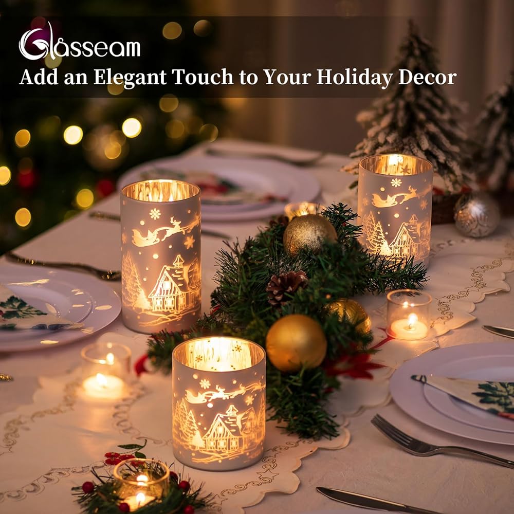 حامل شموع عيد الميلاد الرائع: اصنع مشهدًا شتويًا جميلاً ودافئًا مع تصميم نمط عيد الميلاد الذي يتميز بعناصر مثل الأيائل وبيت الثلج وشجرة عيد الميلاد وندفات الثلج. يتداخل الزجاج الأبيض الفضي الفضي بشكل خيالي مع الضوء الدافئ للشمعة، ويخلق عرضًا آسرًا، مما يجعل حامل الشموع الزجاجي الخاص بنا إضافة رائعة لتزيين طاولة عيد الميلاد الخاصة بك.