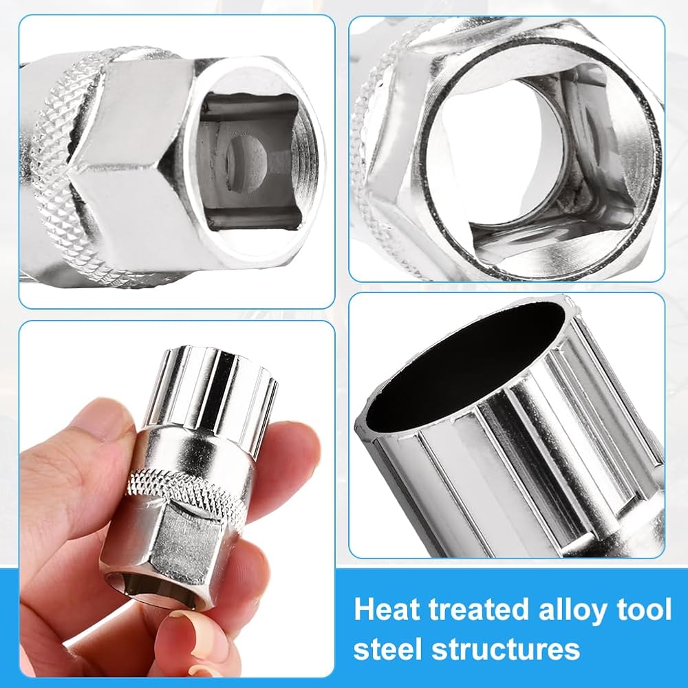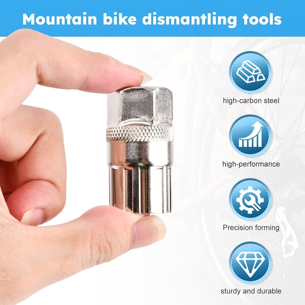【HIGH PERFORMANCE】This mountain bike removal tool is made of better high-carbon steel, making the part of freewheel and bottom bracket removal tools sturdy and durable, hardened by heat treatment.This crank removal tool provides precision in cassette and bottom bracket removal.