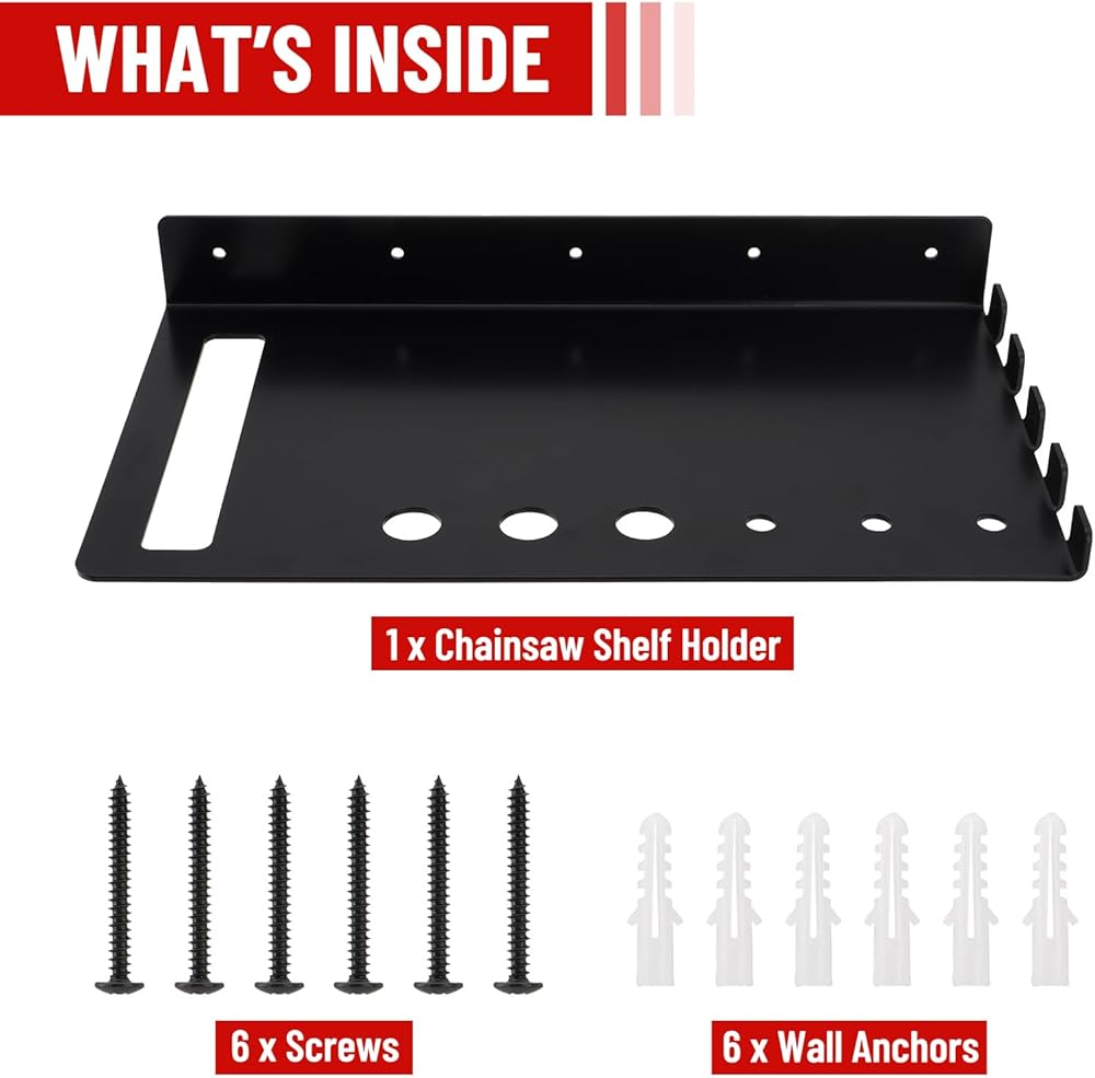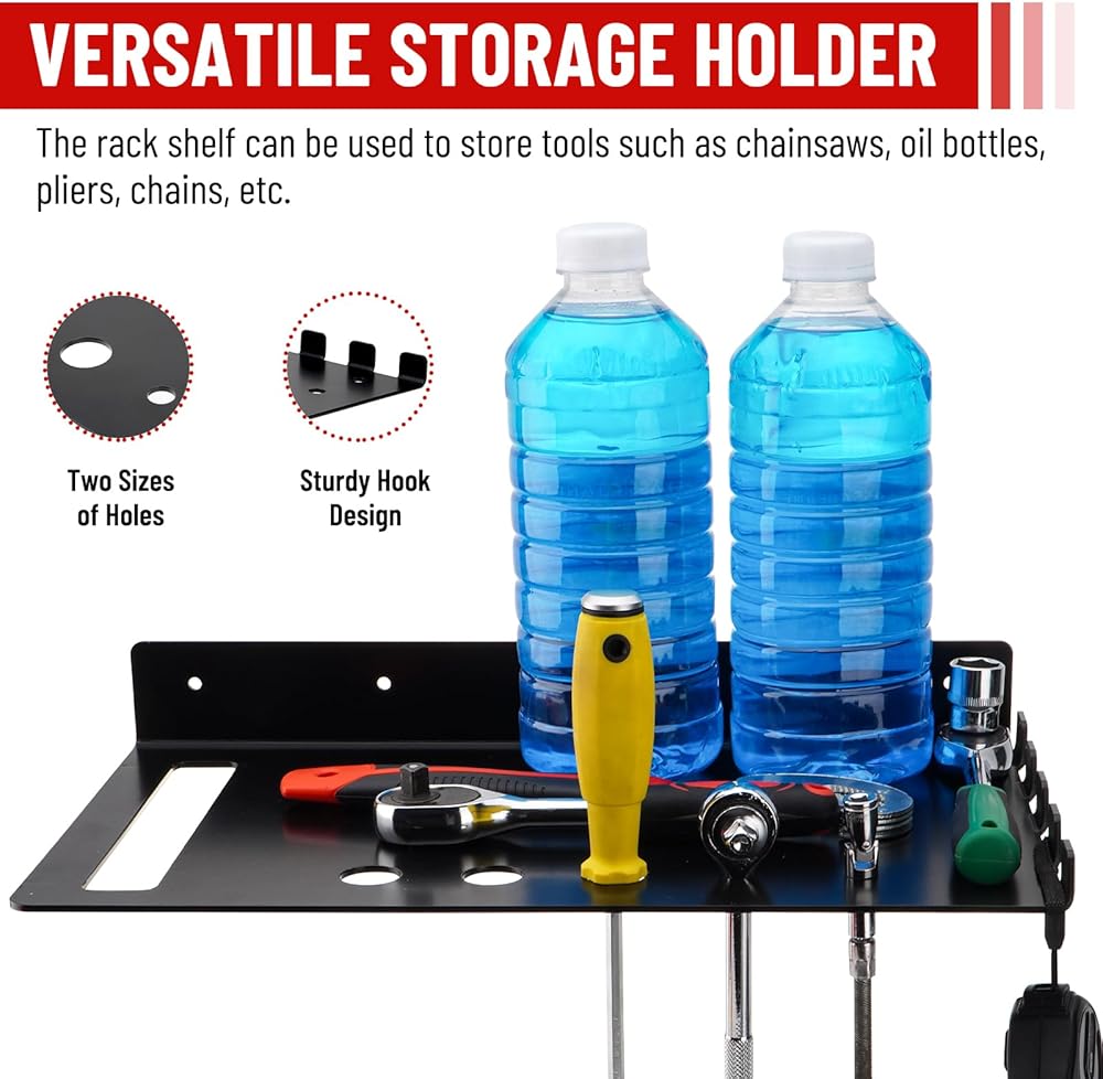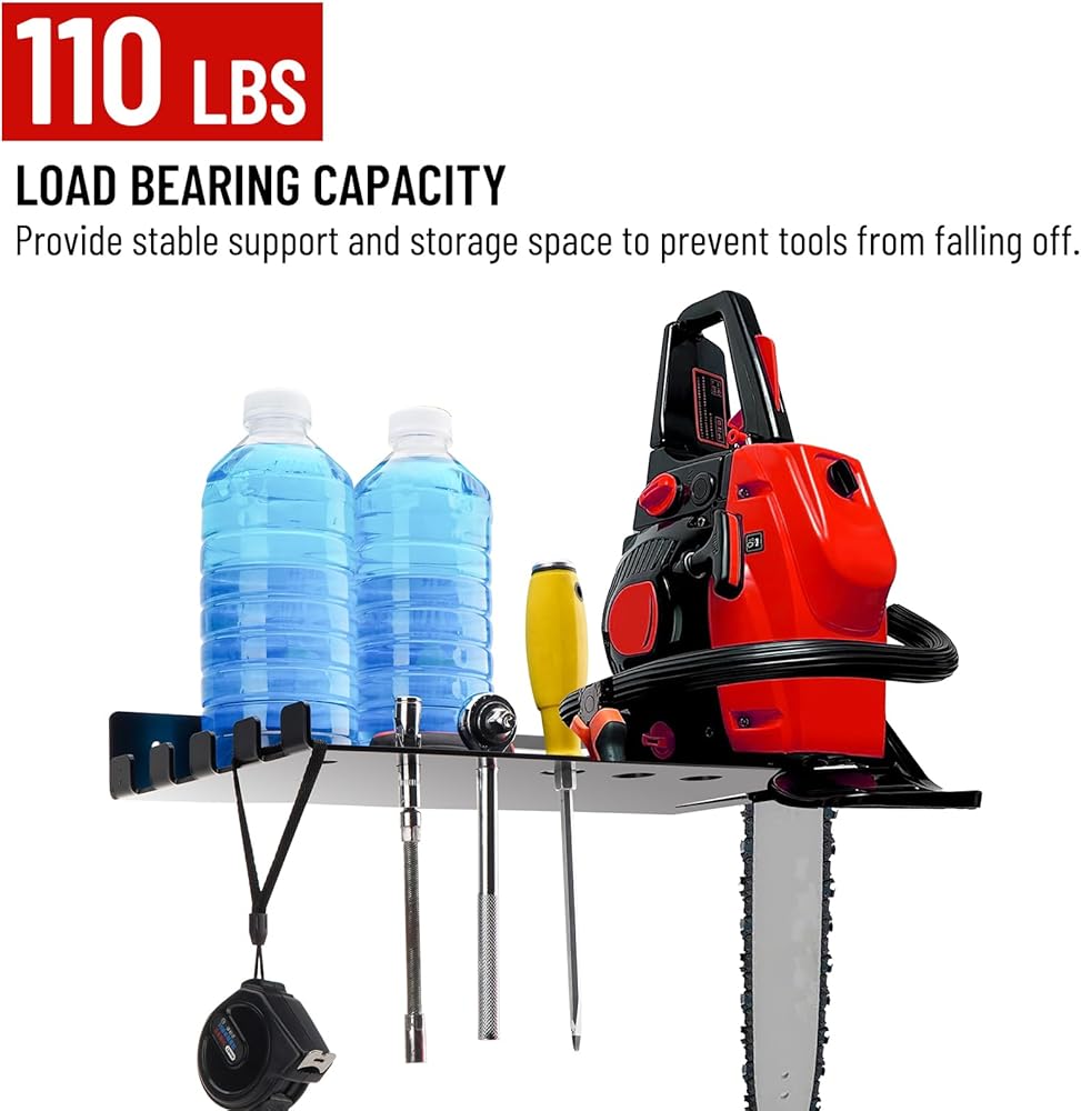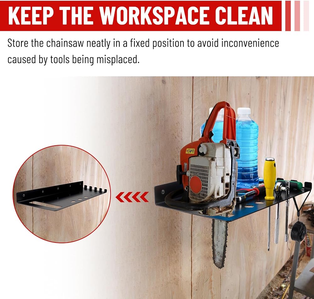 【تصميم موفر للمساحة】يتم استخدام رف شماعات المنشار الجنزيري لتخزين المنشار الجنزيري، ويمكن لخطافات الرف حمل السلاسل الاحتياطية، وقياسات الشريط، والحفاظ على مساحة العمل نظيفة، وتوفير مساحة أكبر.