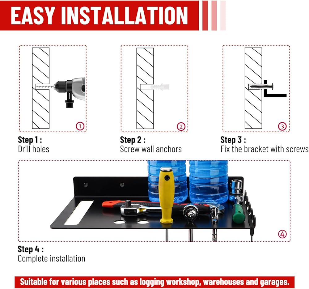 【تخزين آمن】أقصى سعة للحمل: 110 رطل. يمكن لرف التخزين أن يدعم بقوة التخزين الآمن للمناشير والأدوات الأخرى، مما يمنع الأدوات من السقوط.