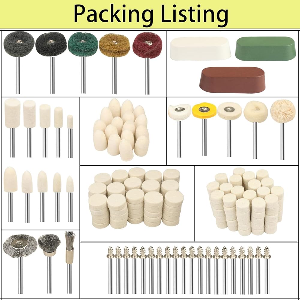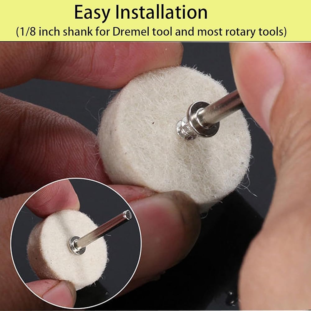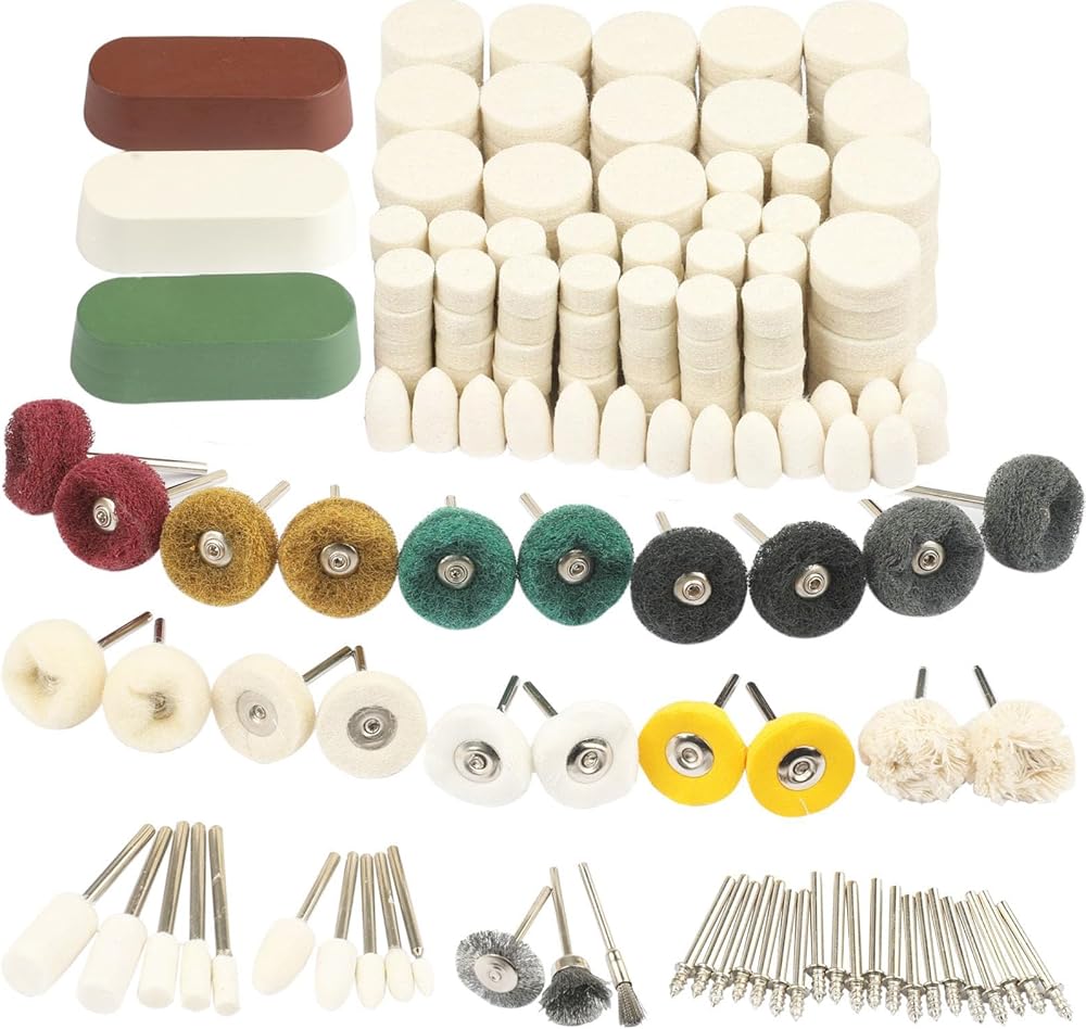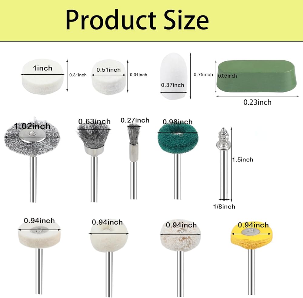 أحجام وأشكال متنوعة: مواد وأشكال مختلفة تناسب الاستخدامات المختلفة. قطر عجلات التلميع 2.5 سم و1/2 بوصة، السيقان 1/8 بوصة. مجموعة عجلات التلميع الكاملة تناسب أدوات Dremel الدوارة وأداة الطحن وأجهزة التلميع والمثقاب اليدوي وما إلى ذلك.