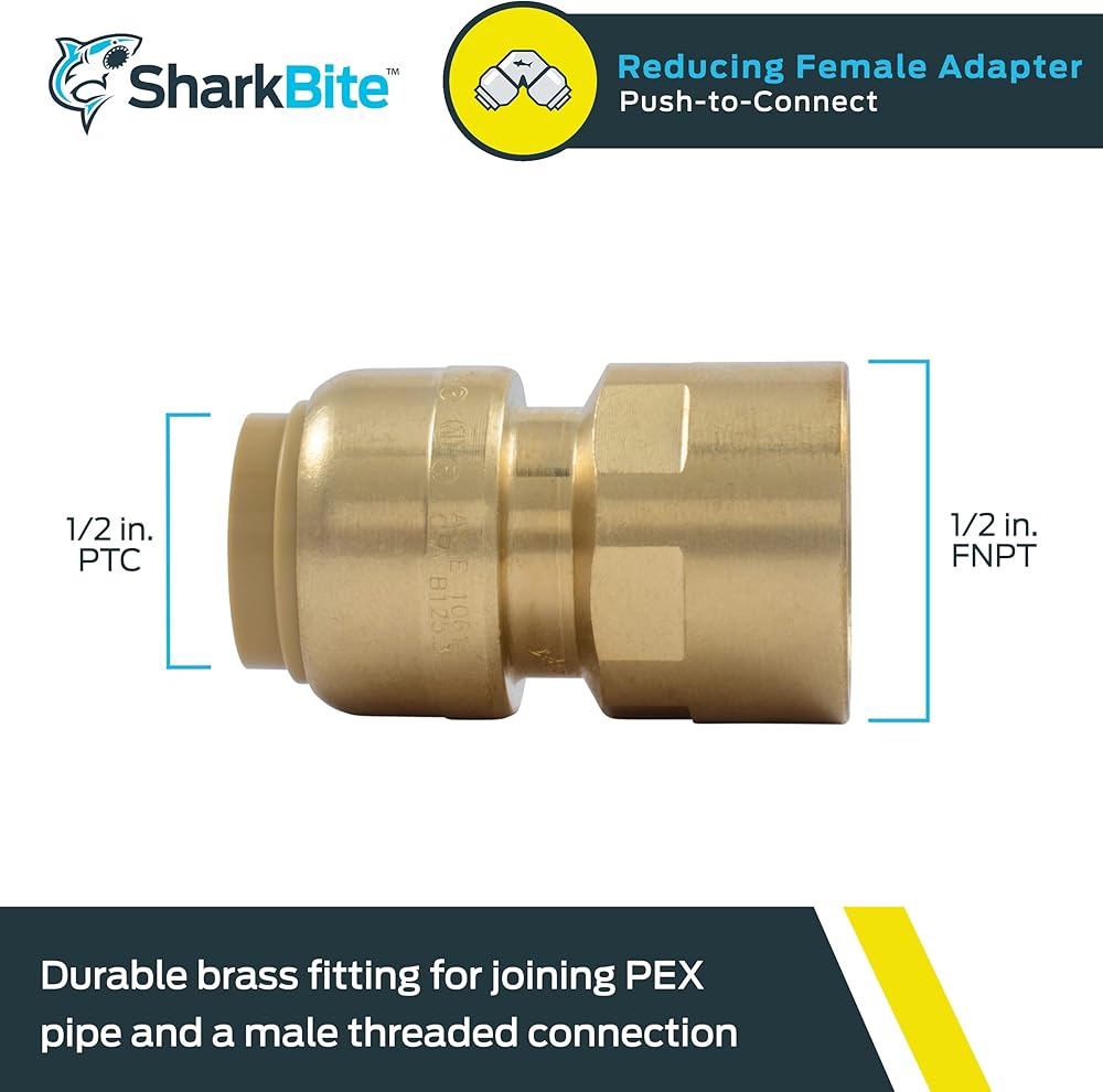 Simplify your plumbing projects with the SharkBite brass push-to-connect female adapters. Composed of DZR forged brass, this plumbing connector is corrosion free and is perfect for making a transition between a pipe and an MNPT thread quickly and easily. This brass plumbing fitting features a push-to-connect design which is ideal for working in tight spaces and can be installed in wet lines. These push-to-connect couplers are easy to install, compatible with PEX, PE-RT, CPVC, SDR-9 HDPE, and copper pipe fixtures, and do not require any special tools, glue, crimping, or soldering for installation. Approved for underground and behind-the-wall applications with no access panels, these push female connectors are suitable for commercial repairs or home improvement projects. SharkBite brass female adapters can withstand 200 degrees F and 200 PSI. 25-year warranty.