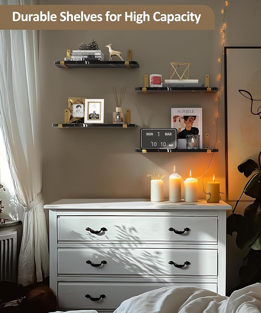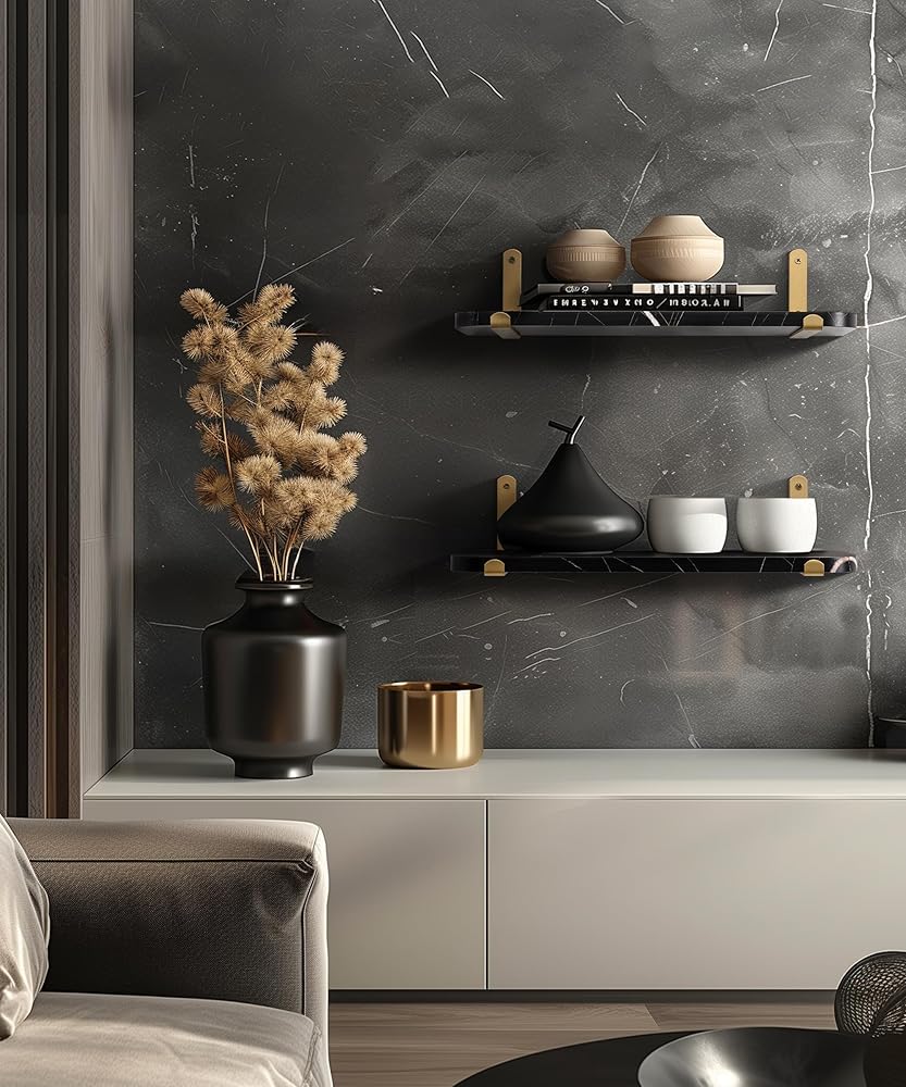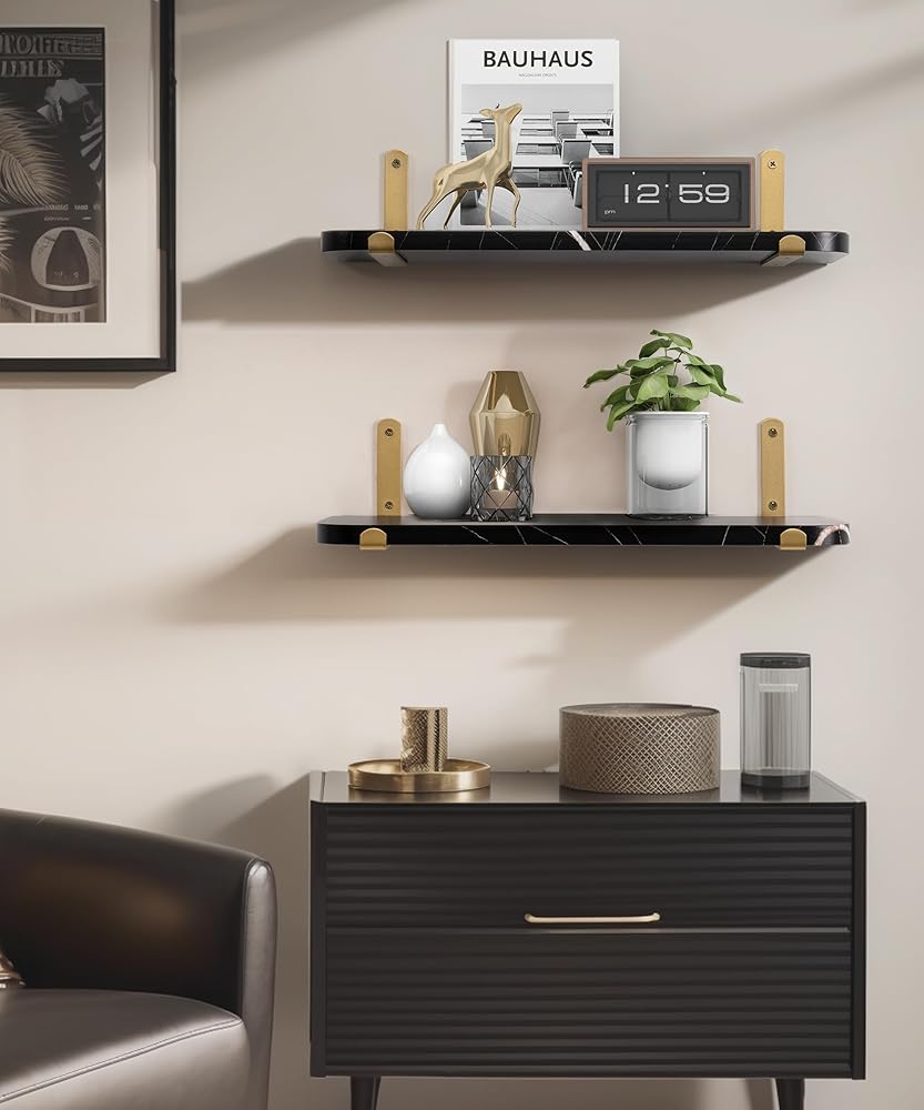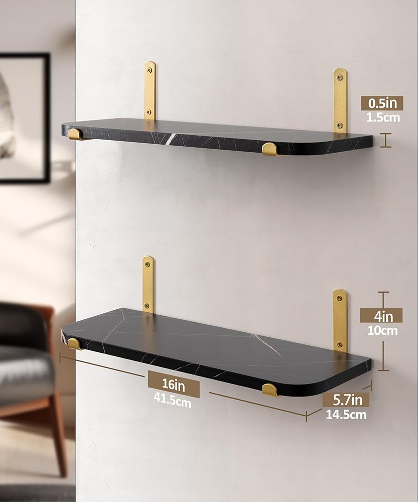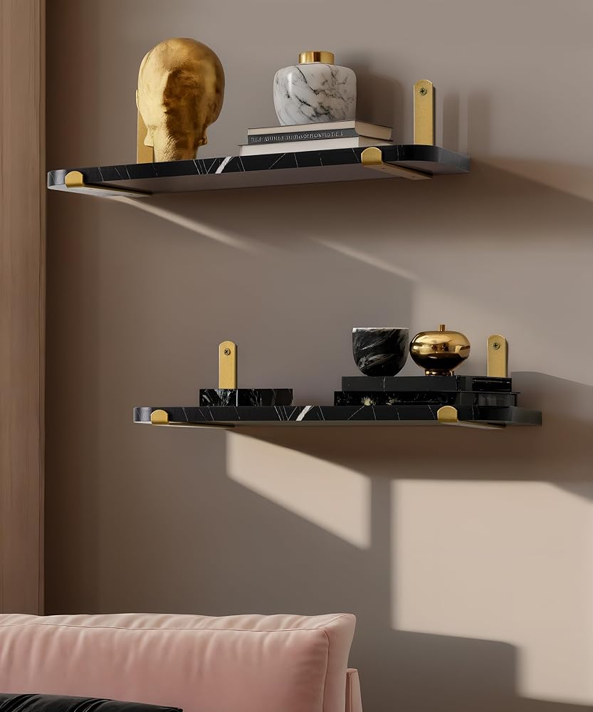 【تصميم رخامي حديث】أرفف الحائط الذهبية السوداء الفريدة هي إضافة أنيقة لأي ديكور منزلي. هذه الأرفف مصنوعة من خشب MDF المتين مع نسيج رخامي، وهي مثالية لإضفاء مظهر عصري