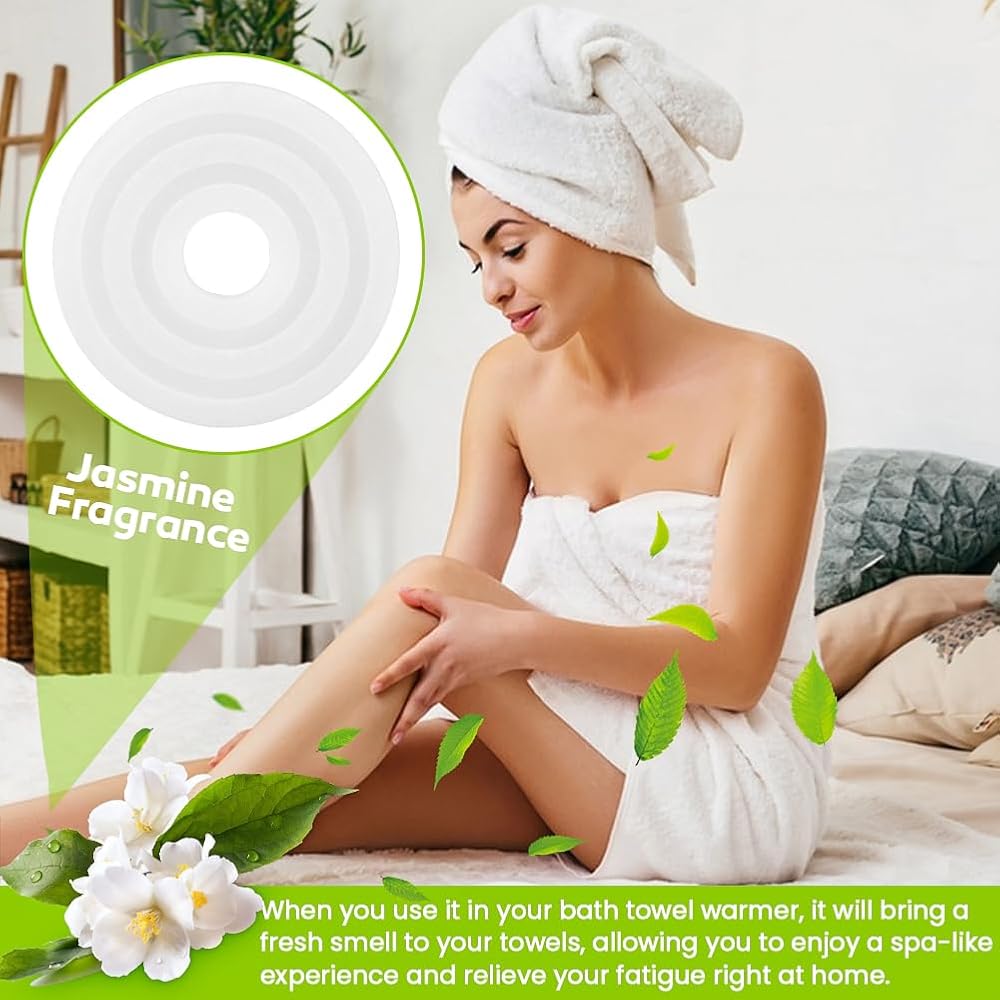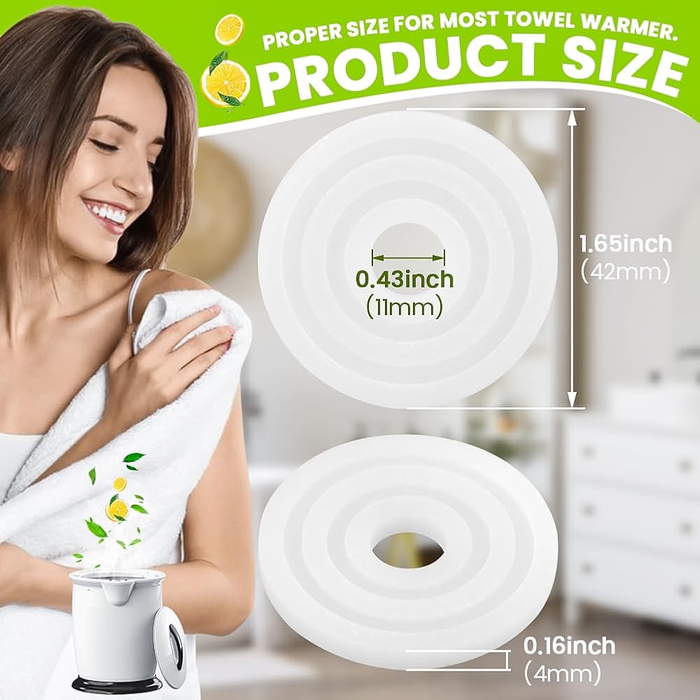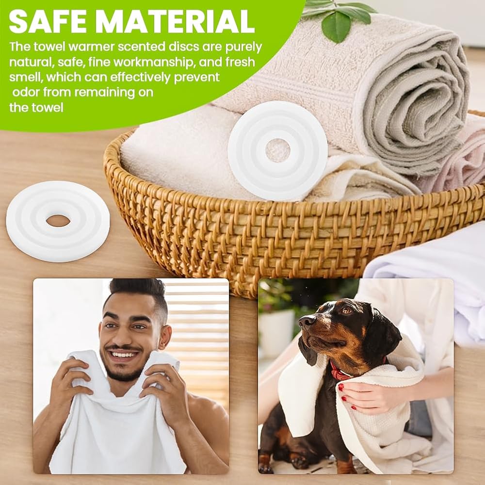 【SAFE MATERIAL】The towel warmer scented discs are purely natural, safe, fine workmanship, and fresh smell, which can effectively prevent odor from remaining on the towel, and bring you an aromatic using experience.Measure about 1.65 inches/ 4.2 cm in outer diameter, and the inner diameter is about 0.43 inches/ 1.1 cm, proper size for most towel warmer.