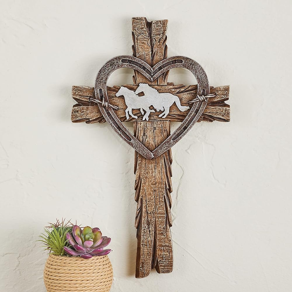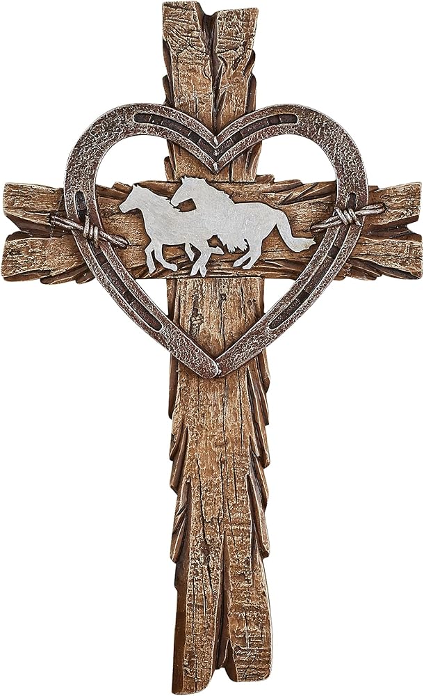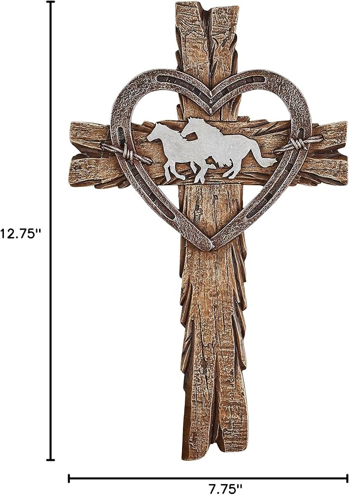 A beautiful and unique symbol of your faith, this wall cross is designed to look like rustic wood and features a horseshoe-styled heart around a pair of running horses. Resin. Measures 7 3/4"L x 12 3/4"H.