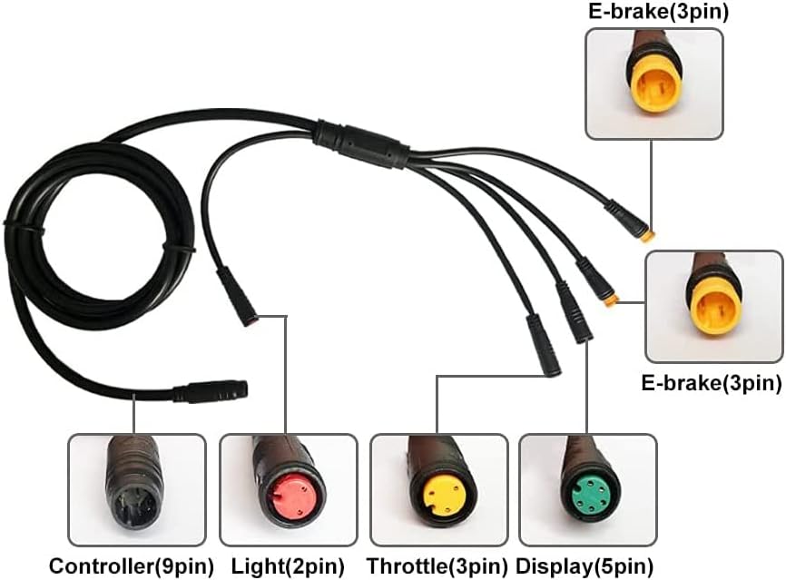 - 3.Controller: 9pin-Male (Black); Light: 2pin-Female (Red); Throttle: 3pin-Female (Yellow); Display: 5pin-Female (Green); E-brake: 3pin-Male (Yellow).
