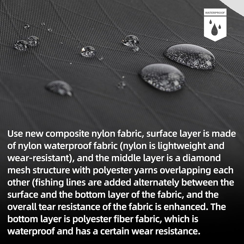 Nylon waterproof fabric.The surface layer is made of nylon waterproof fabric, lightweight and wear-resistant. The middle layer is a diamond mesh structure with polyester yarns overlapping each other, to enhance the overall tear resistance of the fabric. And the bottom layer is polyester fiber fabric, which is waterproof and wear-resistant.