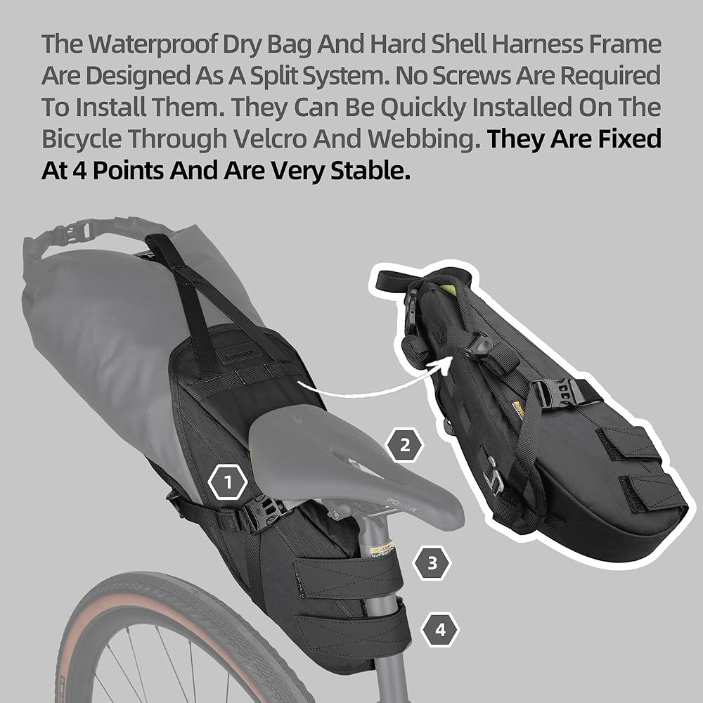 The dry bag uses 210D hot pressed waterproof fabric. And hard shell harness frame are designed as a split system. No screws are required to install them. They can be quickly installed on the bicycle through velcro and webbing. They are fixed at 4 points and are very stable.