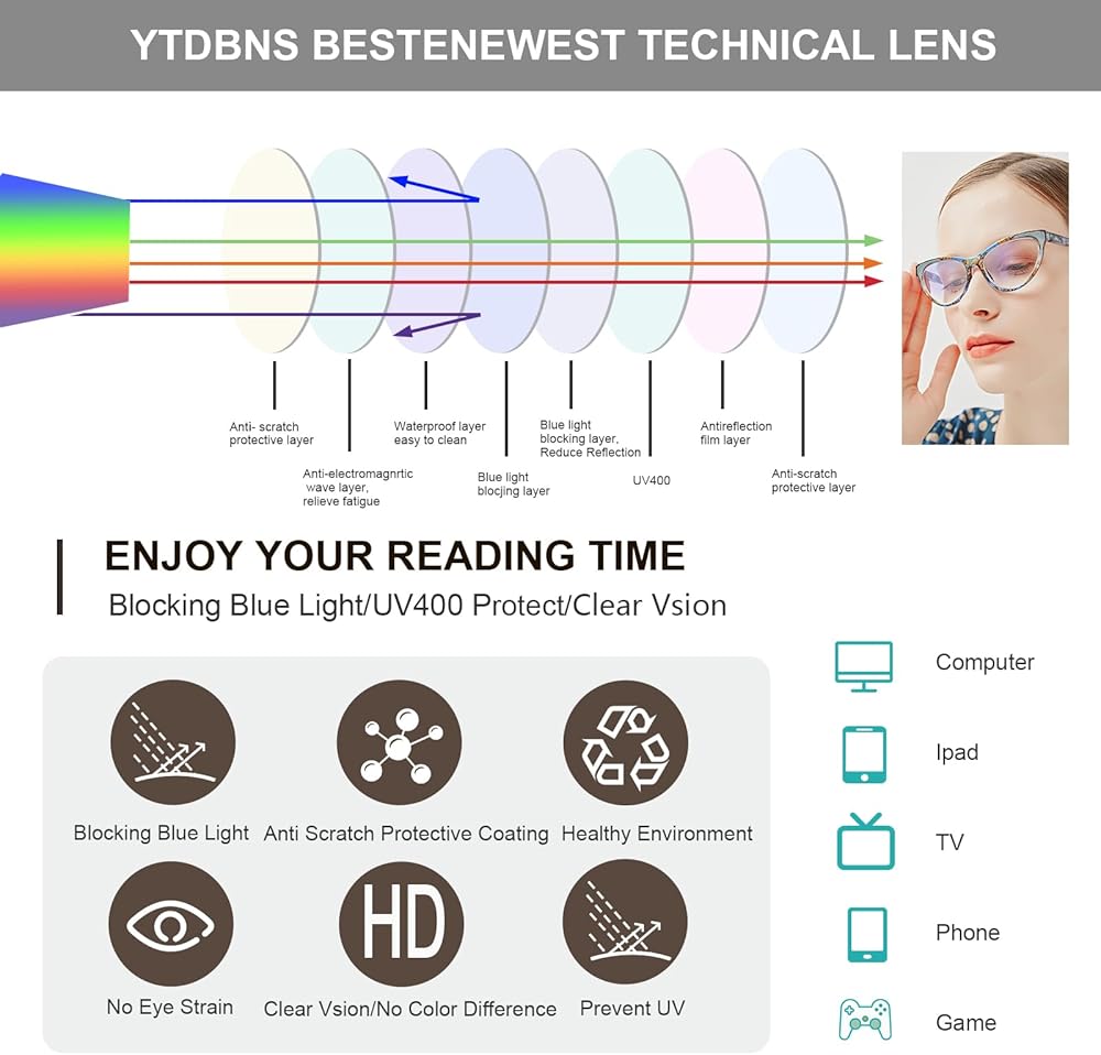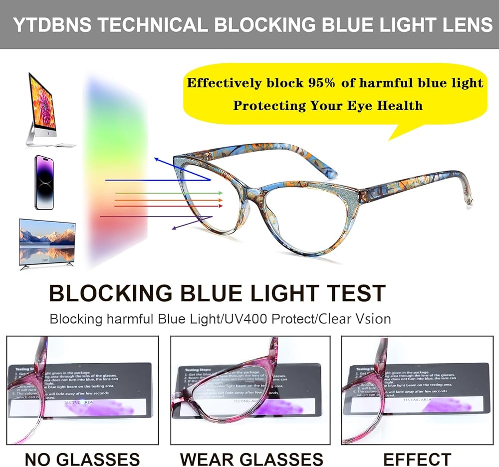 [نظارات زرقاء تحجب الضوء] - نظارات القراءة YTDBNS عين القط مع حماية من الأشعة فوق البنفسجية 400 يمكنها حجب الضوء الأزرق بشكل فعال. نظارات الضوء الأزرق للنساء تخفف من إجهاد العين والجفاف وسقوط الرؤية الناتج عن فترات طويلة من القراءة، باستخدام الكمبيوتر/التلفزيون/الهواتف. تركز YTDBNS على تقنية حجب الضوء الأزرق وتمنحك حياة واضحة في الأوقات الرقمية.