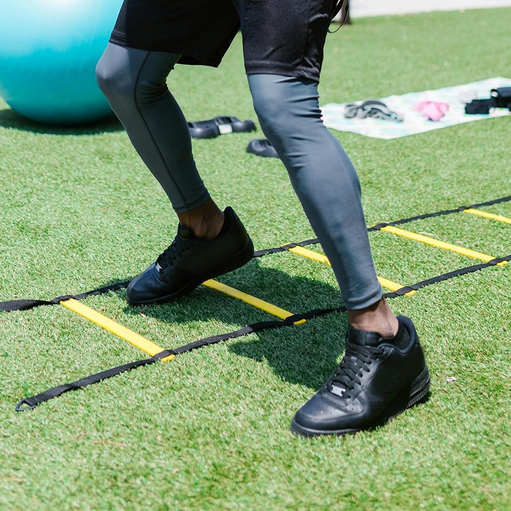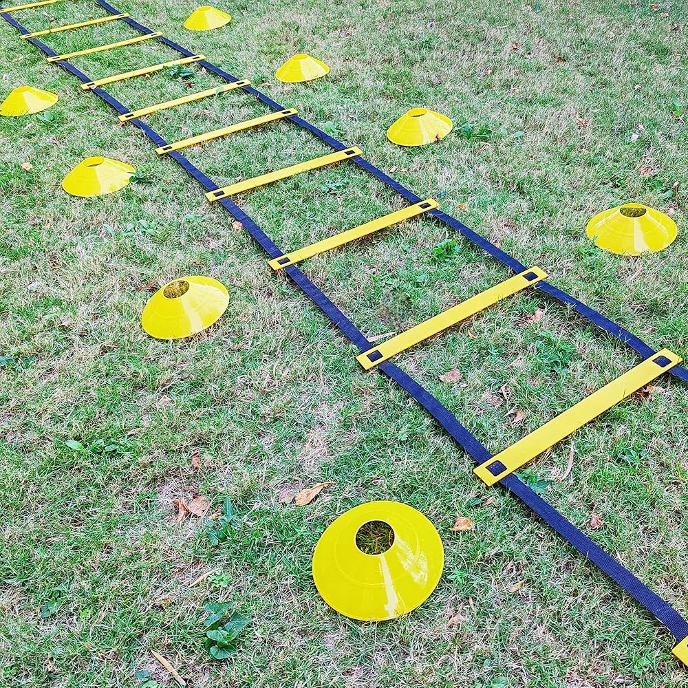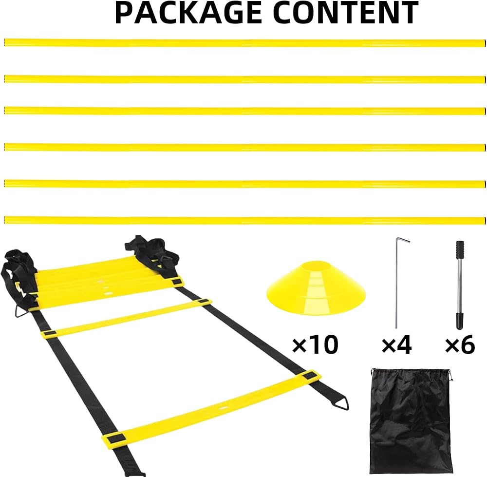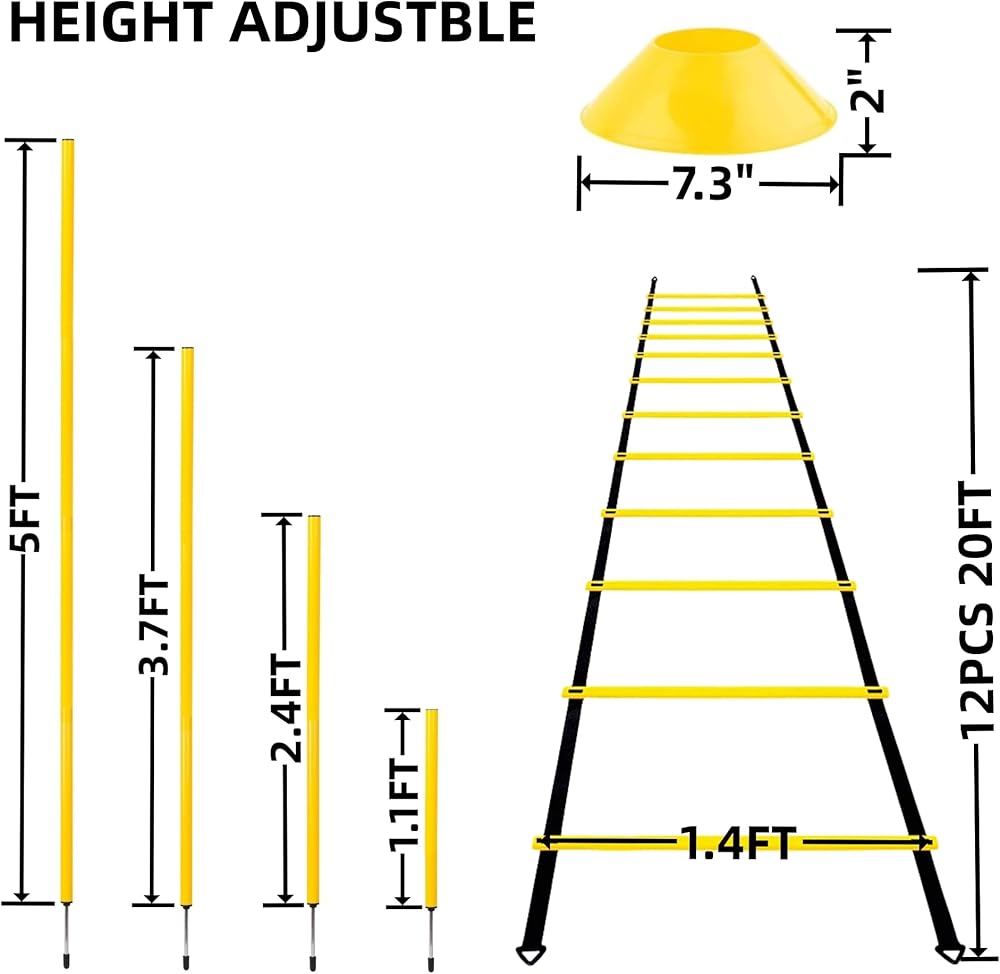 معدات أقطاب تدريب خفة الحركة لكرة القدم: 6 قطع من أقطاب خفة الحركة لكرة القدم قابلة للتعديل بطول 5 أقدام، سلم خفة الحركة بطول 20 قدم، 10 مخاريط كرة قدم، أعواد تدريب كرة القدم للتدريب على السرعة والرشاقة