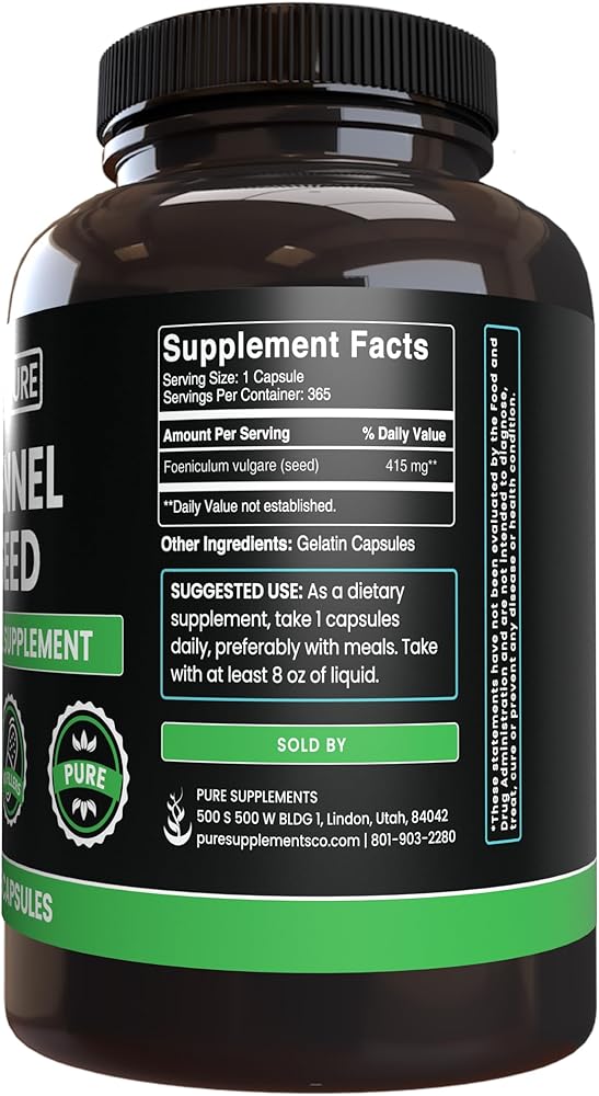 مكونات أصلية نقية، بذور الشمر (365 كبسولة)، خالية من المغنيسيوم أو حشو الأرز، نقية دائمًا، تم التحقق منها معمليًا