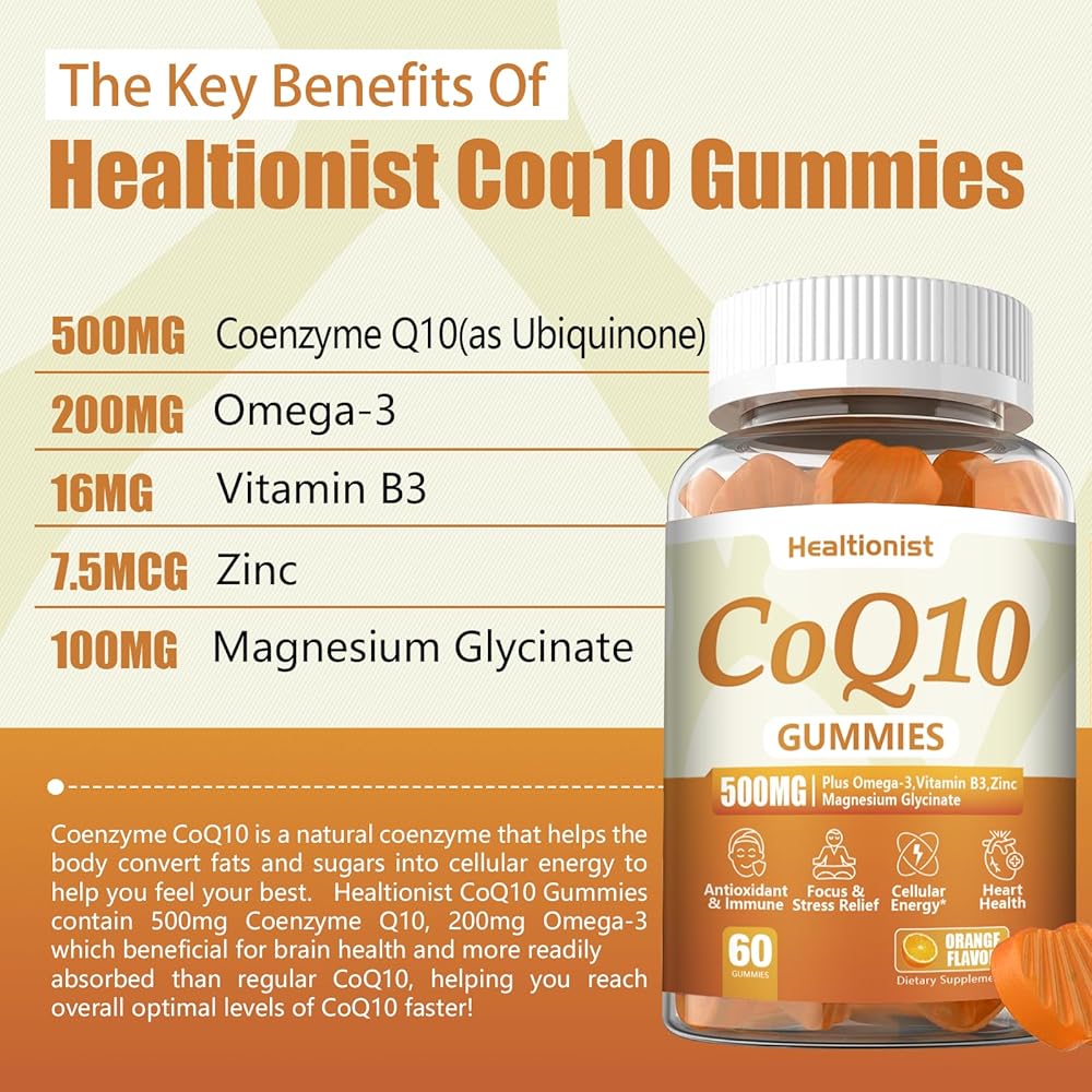 تركيبة متقدمة: صمغ Healtionist coq10 الذي يحتوي على 500 ملغ من الإنزيم المساعد Q10، و200 ملغ من أوميغا 3، و100 ملغ من EPA، و25 ملغ من DHA، و16 ملغ من فيتامين B3، و7.5 ملغ من الزنك، و100 ملغ من المغنيسيوم، هي علكة سهلة الاستخدام مناسبة للنساء والرجال والبالغين والأطفال. أنها لا ترفع مستويات السكر في الدم وتعتمد على البكتين. يمكنك دمجها في روتينك اليومي دون الشعور بالذنب أو التأثير على تفضيلاتك الغذائية.