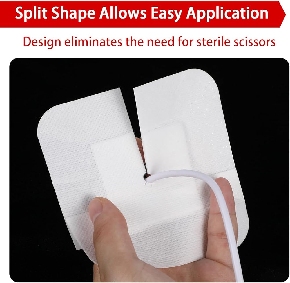 【Pre-cut Slit Design, Keep Feeding Dialysis Tubes Secure】Our Feeding Tube Split Drain Adhesive Bandages feature a unique pre-cut T-slit design that fits drains, peritoneal dialysis catheters, chest tubes, IVs, and tracheostomies snugly without the need for scissors. The convenient slits and center hole are perfectly sized to allow tubes to snap securely into place. The split drain adhesive bandages in place without the use of any tape, with no issues of binding, pulling.