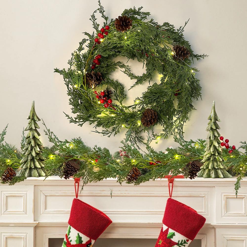 【مادة متينة】مصنوعة من مادة PVC عالية الجودة، متينة وسهلة التخزين. بالإضافة إلى ذلك، تم تصميم نهاية إكليل السرو الصناعي بحلقة تعليق مع خطافين لسهولة التركيب والتوصيل.