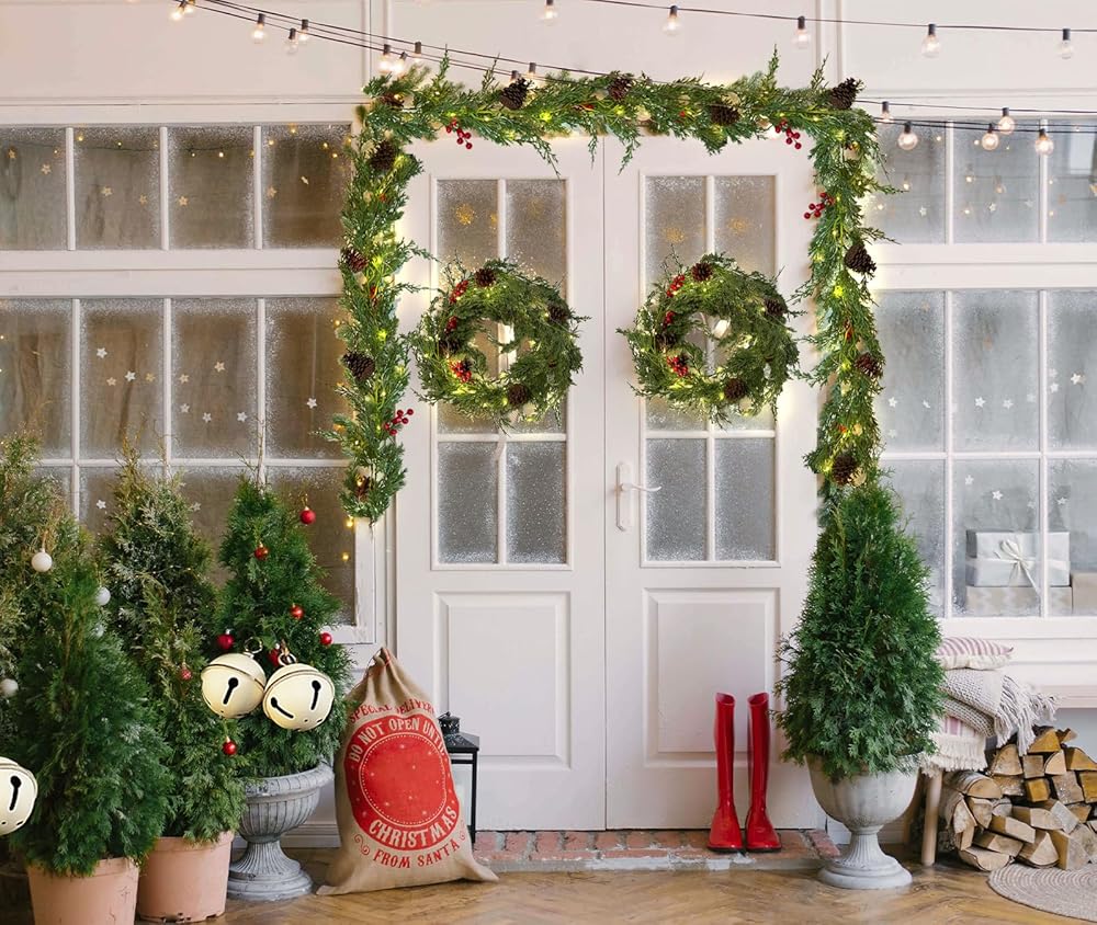 الاستخدام على نطاق واسع: إكليل عيد الميلاد المضاء مسبقًا هو عنصر لا غنى عنه لعيد الميلاد لإضافة البهجة الاحتفالية إلى منزلك! ضع إكليل عيد الميلاد الأخضر مع الضوء على قطع المواقد وطاولات الطعام وقضبان السلالم والدرابزين والجدران والمداخل والنوافذ وفي أي مكان آخر.