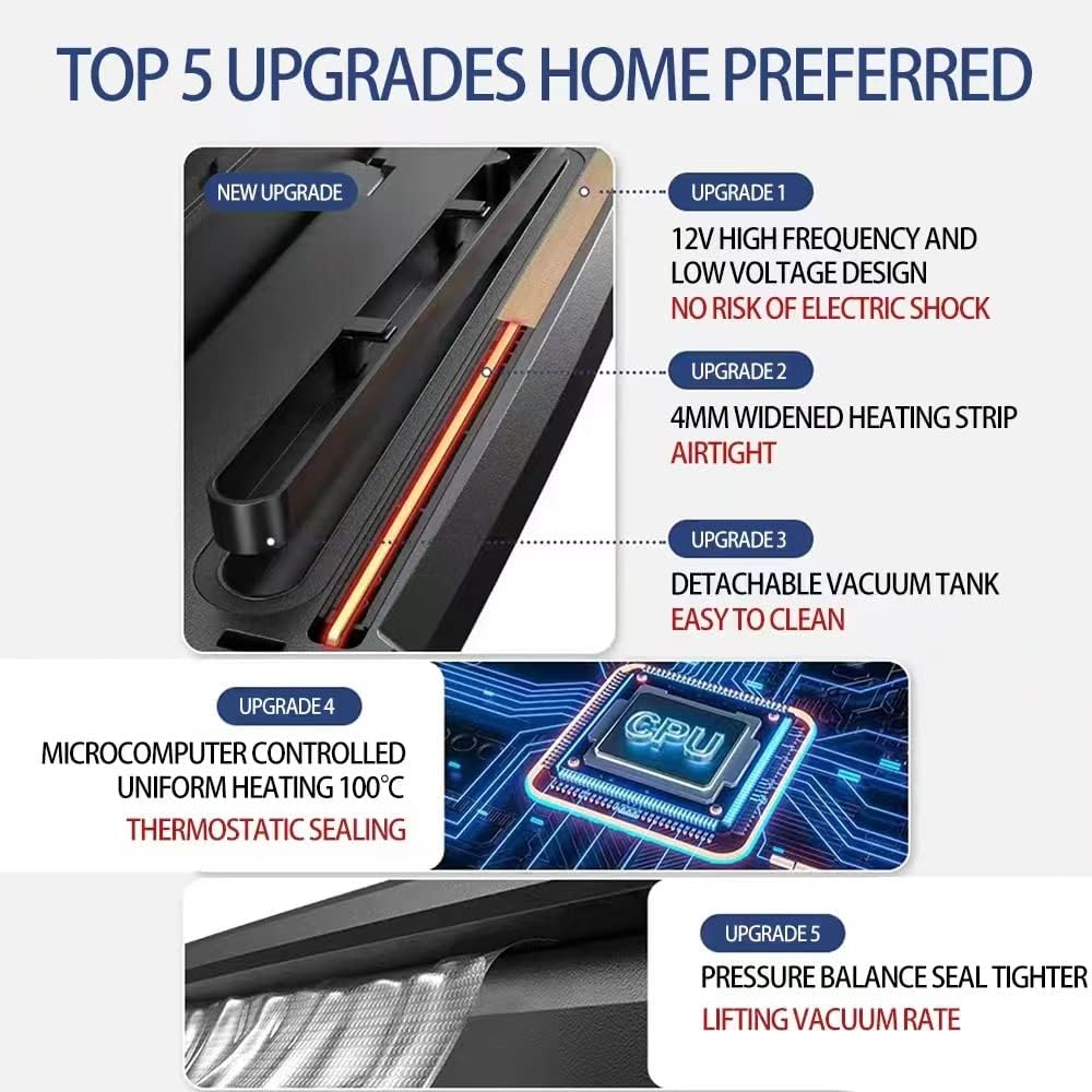 🦑شفط قوي 60 كيلو باسكال: مانع تسرب الهواء سريع وفعال مع تقنية نظام إغلاق الهواء القوية المطورة. بالمقارنة مع آلات ختم الطعام الأخرى ذات الشفط المنخفض، يوفر الشفط الأقوى وشريط الغلق الحراري الممتد عالي الجودة مستوى الفراغ الأمثل وختم محكم، ويمكن إكمال الفراغ والختم في غضون 10-20 ثانية بسرعة. الجزء الأكثر تميزًا هو أنه يمكنه تفريغ الأطعمة الرطبة مثل السوائل والحساء.