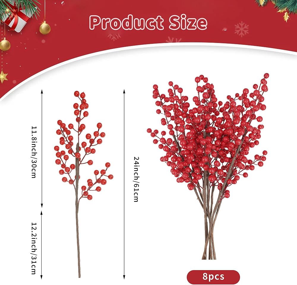 • Package content: you will receive 8 pieces of red berry branches, and each berry stem is about 24 inch in length, sufficient quantity and proper size to meet your decoration needs. Please note that due to the length of the stems, we will need to bend the stems for packaging. Once received, you can easily unfold the branches and adjust them to their original shape.