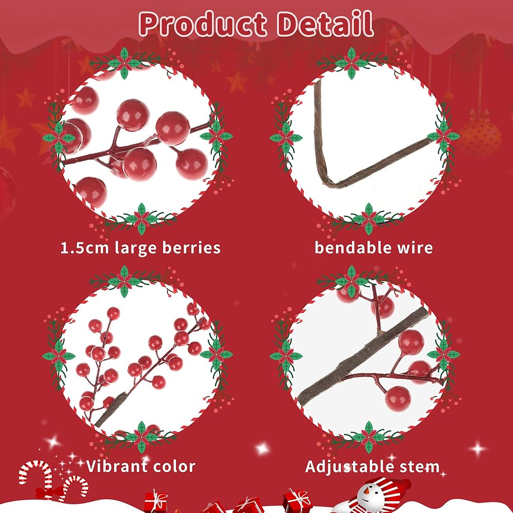 • Quality material: the artificial holly berries are made of foam, and the surface of the berry is covered with a smooth waterproof coating, lightweight and waterproof, not easy to break or fade; the berry branches are made of iron wire, sturdy and flexible, can serve you for a long time.