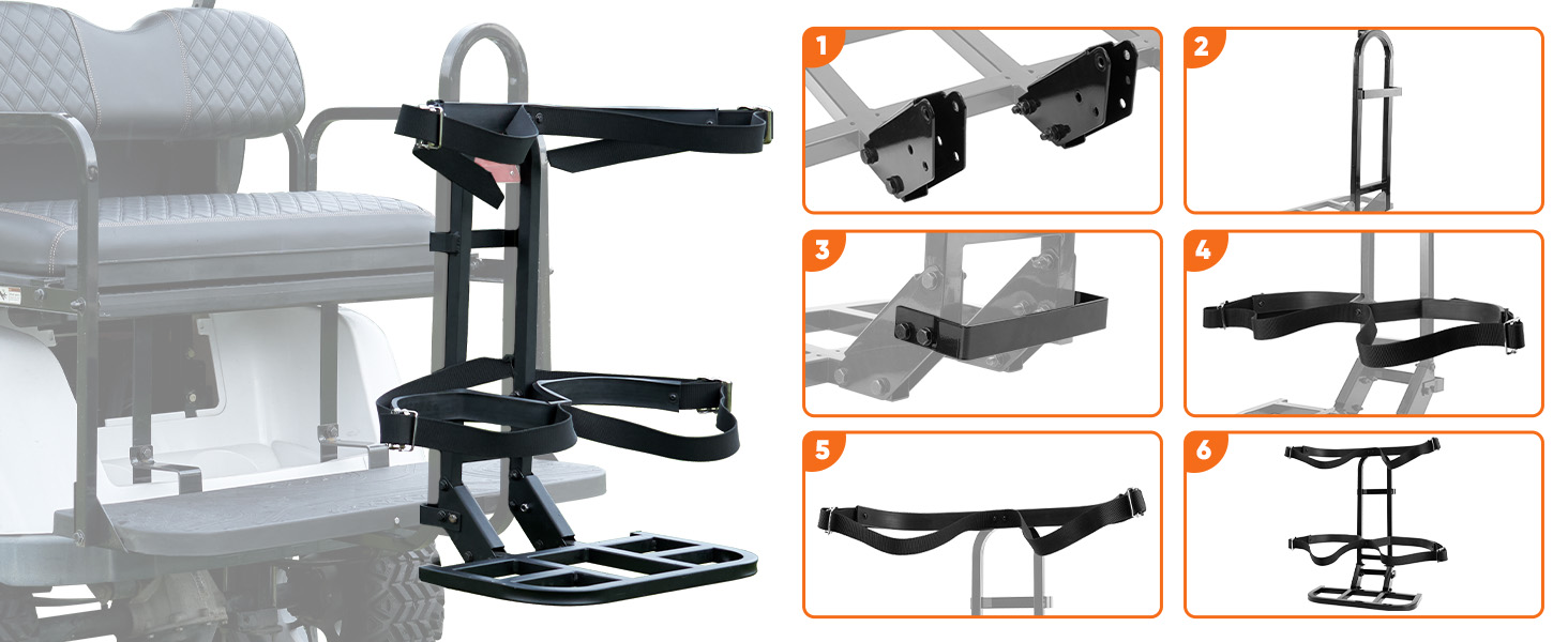 ملاحظة مهمة: يتم ربط حامل الحقيبة هذا بقضيب الأمان الخلفي لعربة الجولف الخاصة بك (يُباع بشكل منفصل) وهو غير مناسب لقضبان الإمساك ذات الدعم المركزي أو بدون خطوة سفلية للتركيب.