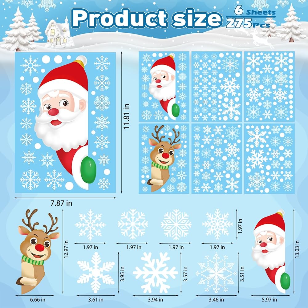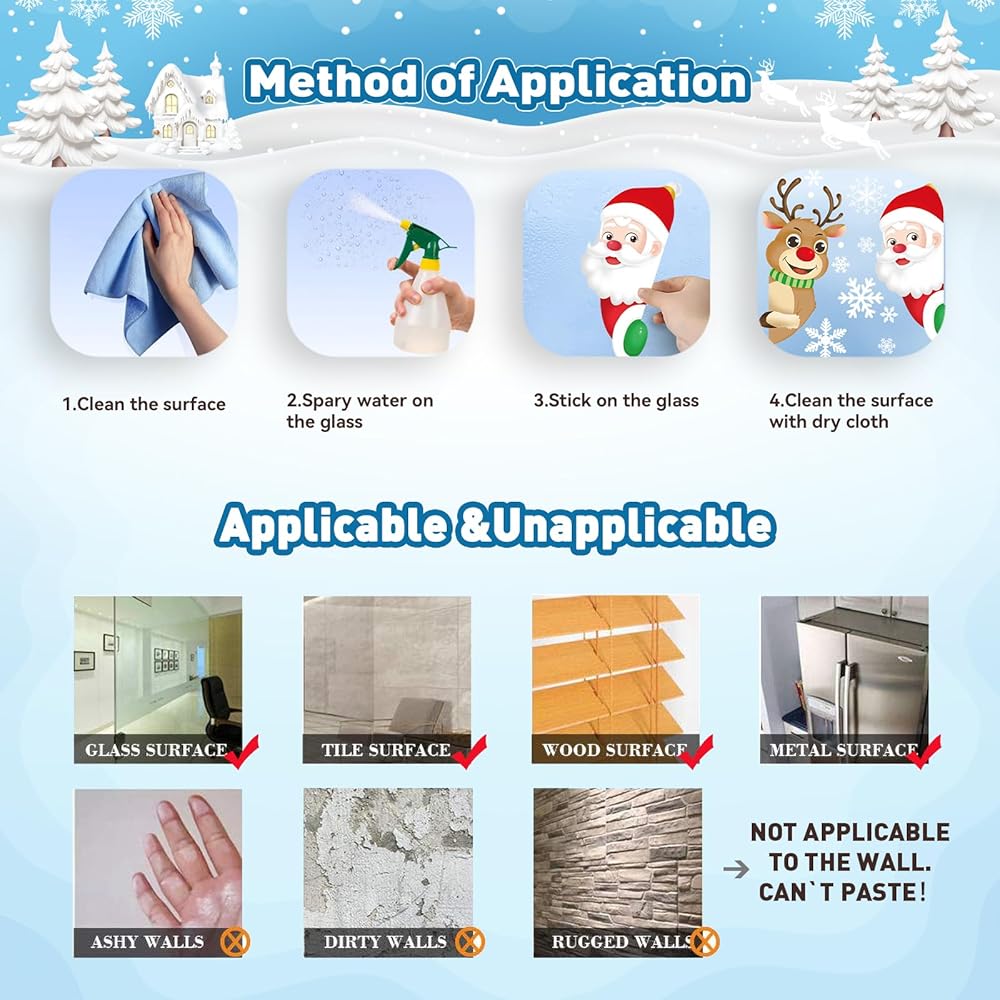 Made from high-quality, durable materials, these Christmas window stickers are easy to apply and remove, leaving no residue behind. Simply peel the snowflake window clings off the backing and press them onto any smooth surface, including glass windows, mirrors, and even walls. These Christmas window decorations can be reused year after year, making them a smart and affordable choice for holiday decorating.