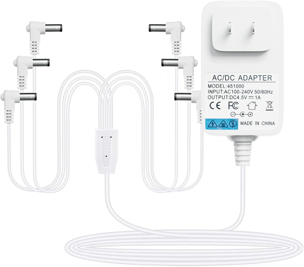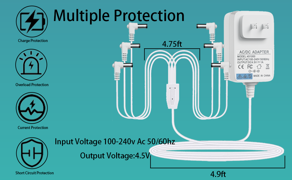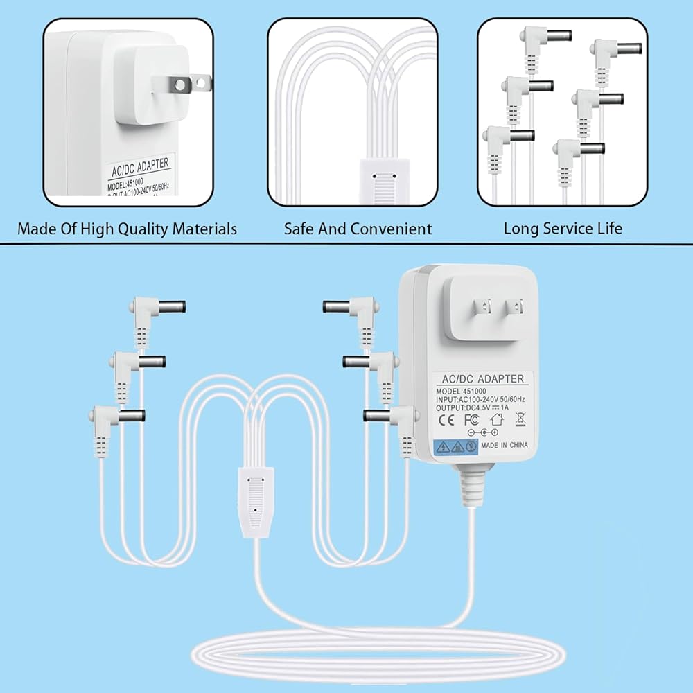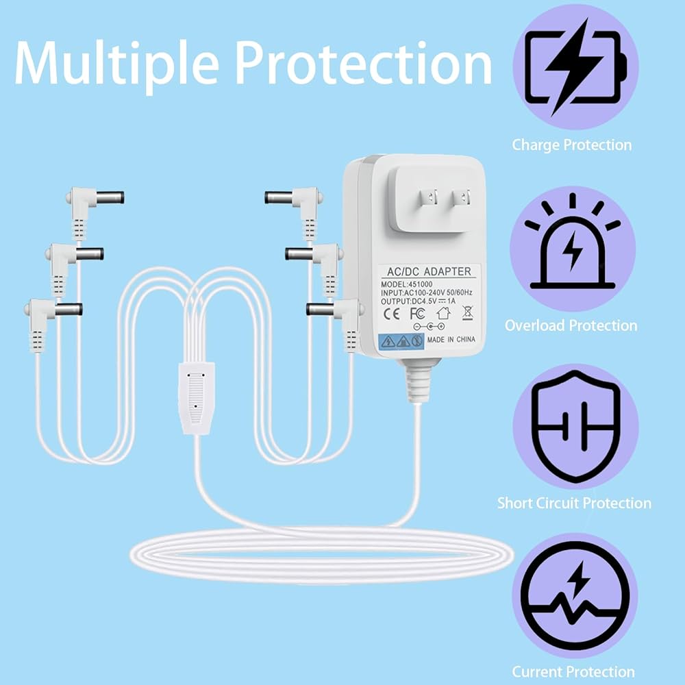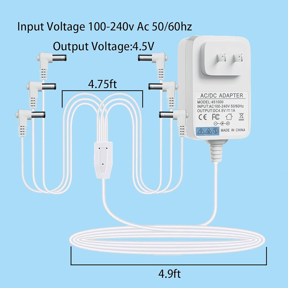 مواصفات المنتج: جهد الإدخال: تيار متردد 100 - 240 فولت 50/60 هرتز، جهد الخرج: 4.5 فولت، مزود بميزات أمان حماية من الجهد الزائد (OVP)، حماية من التيار الزائد (OCP)، حماية من الدائرة القصيرة (SCP)