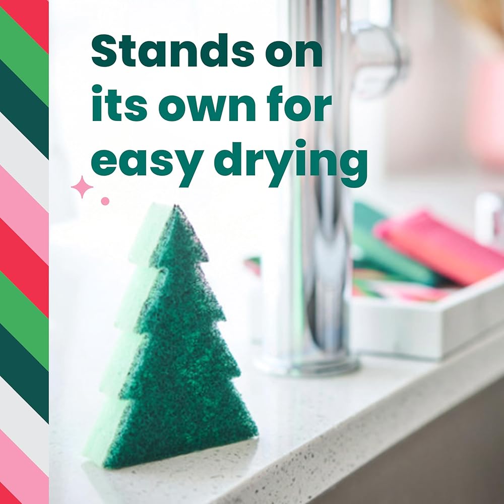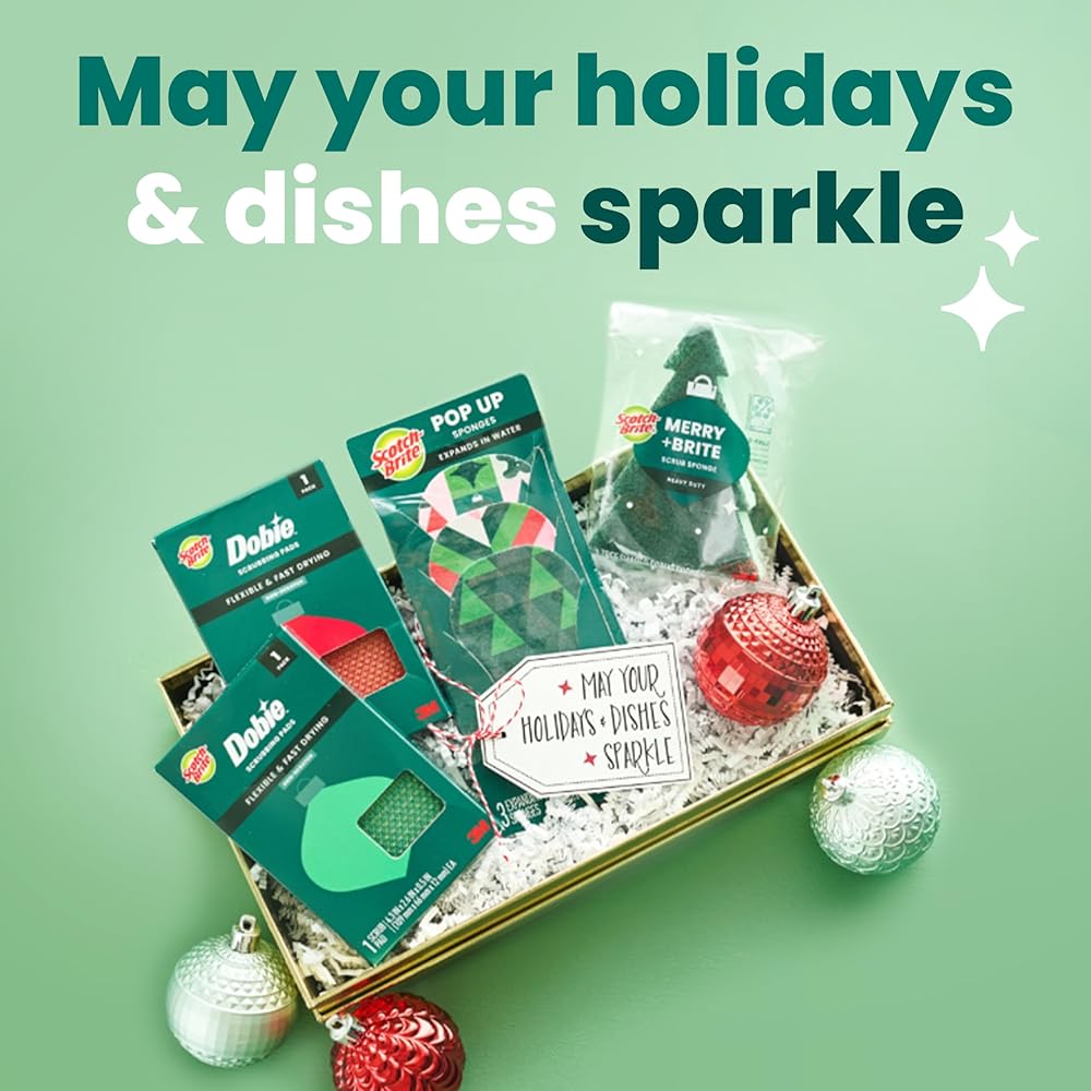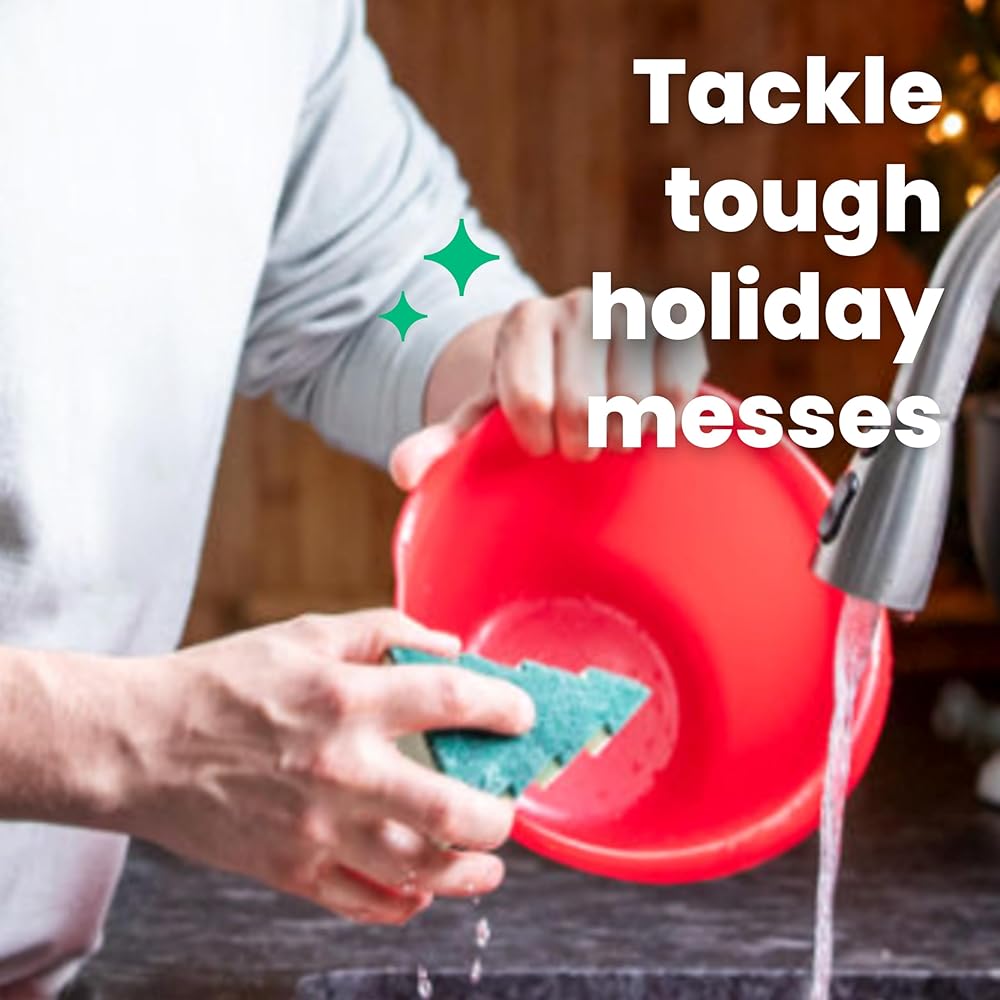‘TIS THE SEASON FOR JOYFUL CLEANING: This Scotch-Brite Merry+Brite Heavy Duty Scrub Sponge that makes holiday cleanup as joyful as the season