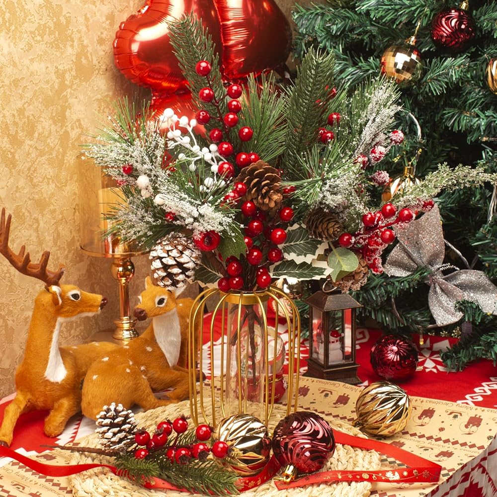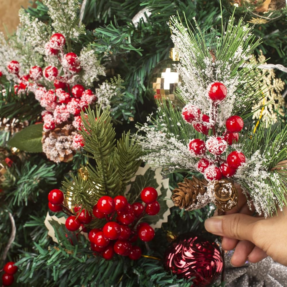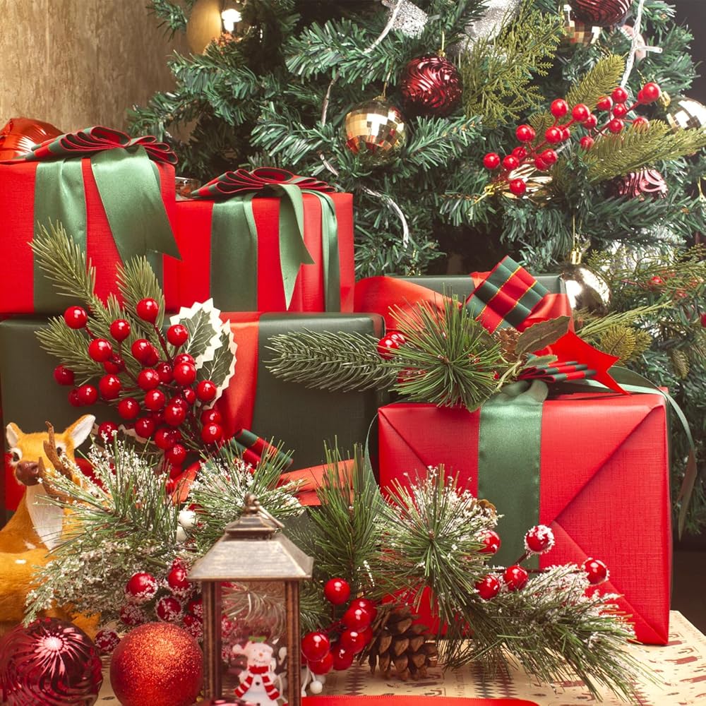 Easy to Use: These Assorted Red Berry Picks and Faux Pine Picks Spray can be effortlessly incorporated into any arrangement or wreath, making it simple to achieve a professional-looking holiday display in your home.