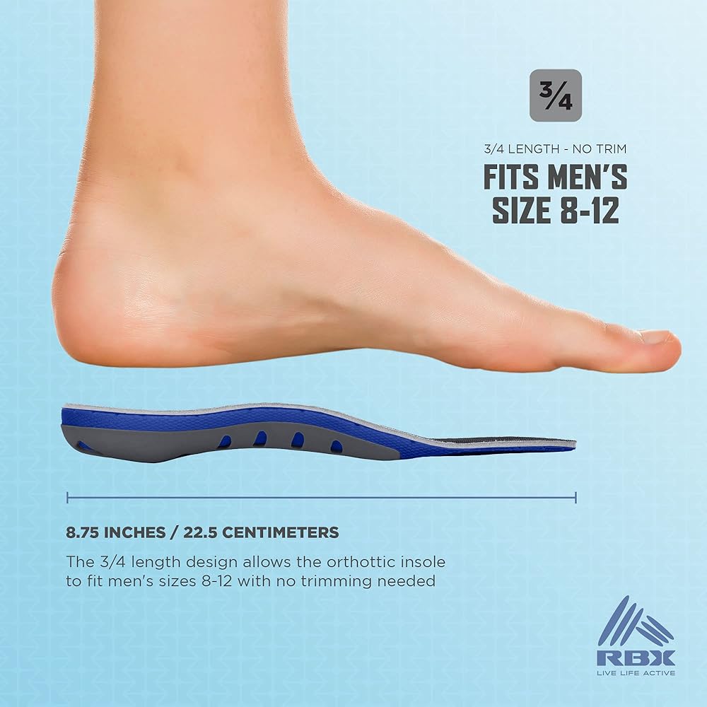 Designed to relieve fatigue and heel pain caused by plantar fasciitis, RBX performance orthotic insoles feature a generous gel heel cup that absorbs impact with every step to keep you comfortable and stable all day long. Great for work shoes, casual athletics, hiking, walking, running, and long days of standing, RBX insoles use adaptive memory foam to cushion and contour to the unique shape of your feet. Perfect for low-profile footwear, these 3/4-length insoles feature a flexible cross-vented torsion cage that promotes arch stability, improves balance, and strengthens lateral support. Hydrowick fabric technology helps control moisture to keep your feet cool and dry during exercise and daily activities. The 3/4-length insoles don't require any trimming- just slide them in, and they're ready to go.