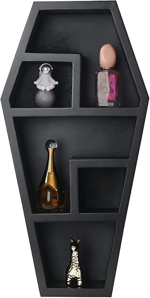 • تخلص من الديكور التقليدي والممل، سيمنحك رف Gute Coffin Curio لمسة قوطية ومخيفة لديكورات منزلك! يحتوي رف Gute Coffin Curio على 19 حجرة يمكن ملؤها بمجموعتك المفضلة من الأشكال المخيفة أو القوطية أو أي مجموعات صغيرة.