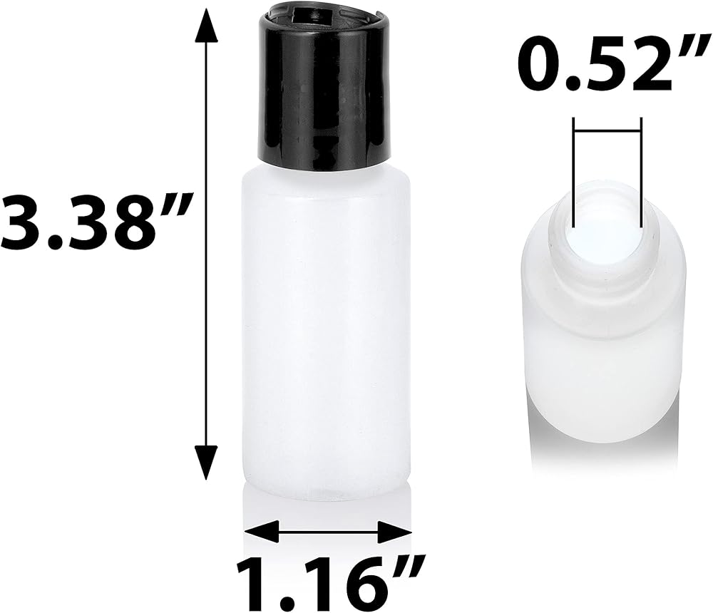 MEASUREMENTS: Height - 3.38" x Diameter - 1.16". SOLID CONSTRUCTION: Our finger press flip disc lid lets you easily dispense just the right amount and "CLICK CLOSE" ensures your products do not leak or spill out in travel and transit. REFILLABLE: Durable and nearly unbreakable, HDPE plastic is ideal for bath, kitchen, and cleaning uses. BPA FREE: Our HDPE bottles are BPA Free- ensuring no toxic, harmful chemicals will leach into your products. GIFTING: Plastic Bottles perfect for GIFTS in aromatherapy, home, kitchen, bath, decor, gifts, and resell.