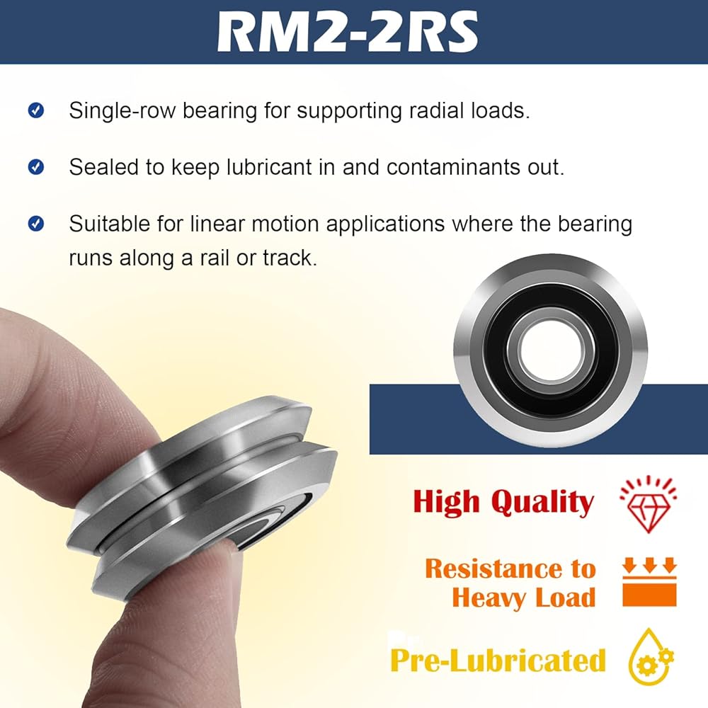 【محمل كروي RM2-2RS 】محمل كروي على شكل حرف V مختوم مقاس 3/8 بوصة. محمل صف واحد لدعم الأحمال الشعاعية. مختومة للحفاظ على مواد التشحيم والملوثات خارج. مناسب لتطبيقات الحركة الخطية حيث يمتد المحمل على طول السكة أو المسار.