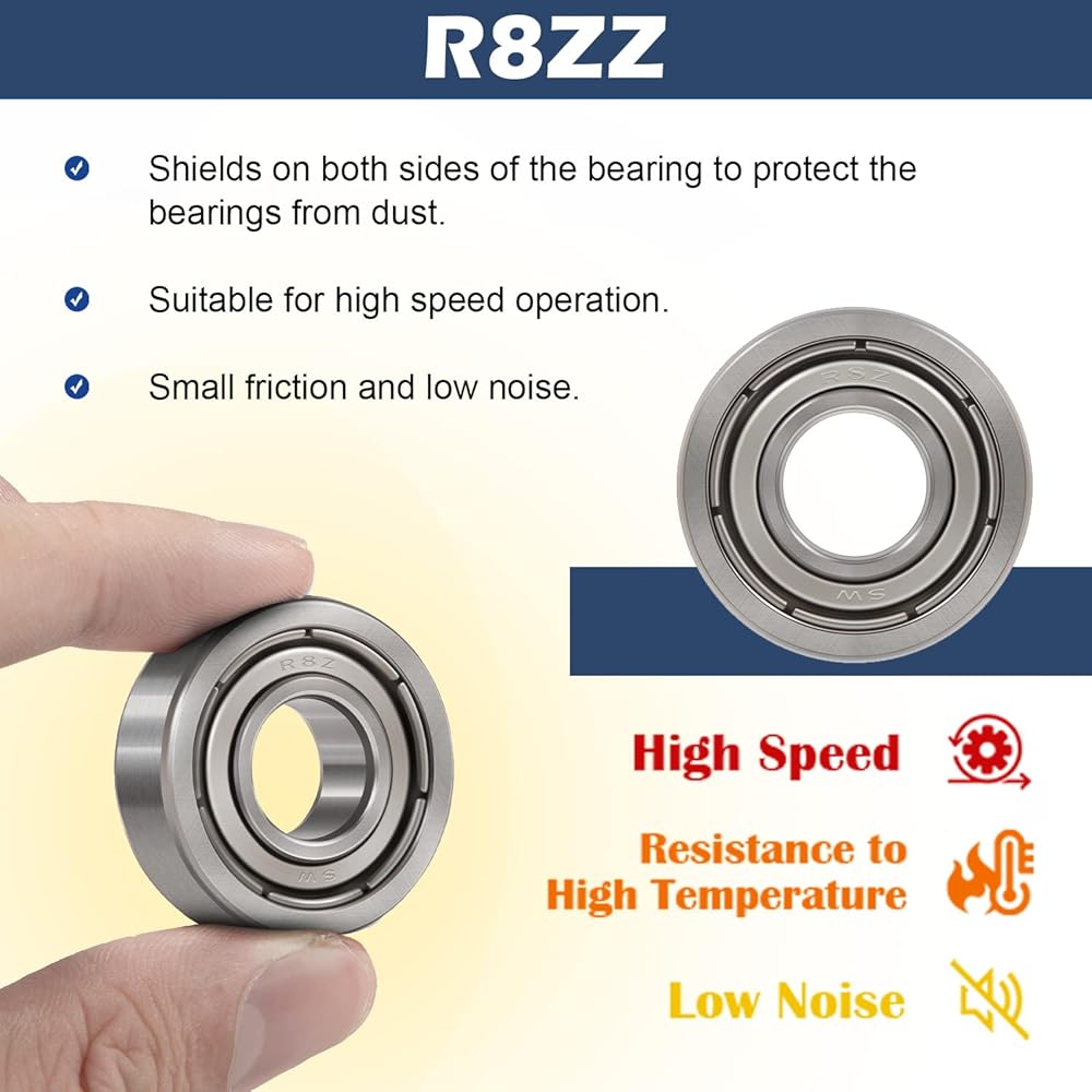 【محمل كروي R8ZZ】القطر الداخلي = 1/2 بوصة، القطر الخارجي = 1-1/8 بوصة، السُمك = 5/16 بوصة. تساعد الدروع الموجودة على جانبي المحمل على إبقاء مادة التشحيم داخل المنزل وخارجه من الغبار. سرعة عالية .