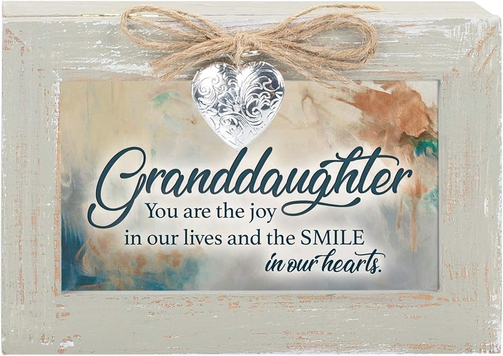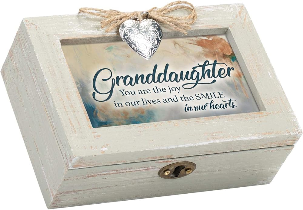 Cottage Garden inspirational and sentimental products are both lovely and classic in style. Be encouraged by a message that reads, "Granddaughter. You are the joy in our lives and the smile in our hearts". Made of solid wood material; Trendy wood pallet look design with distressed, weathered Wood finish. Jewelry box measures approximately 6 x 4 x 2.25 inches; Replace artwork with 3 x 5 inch personal photo. Traditional wind-up mechanism engages music to play melodic tune Edelweiss. Insert photo in functional metal locket; Vintage turn-key lock design to secure your little treasures and keepsakes. Ships in protective packaging; Ready for giving to that special someone.