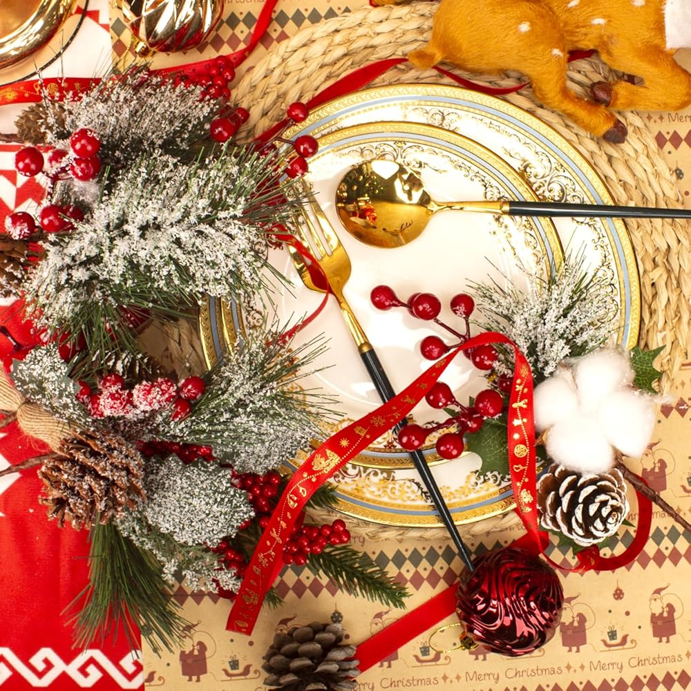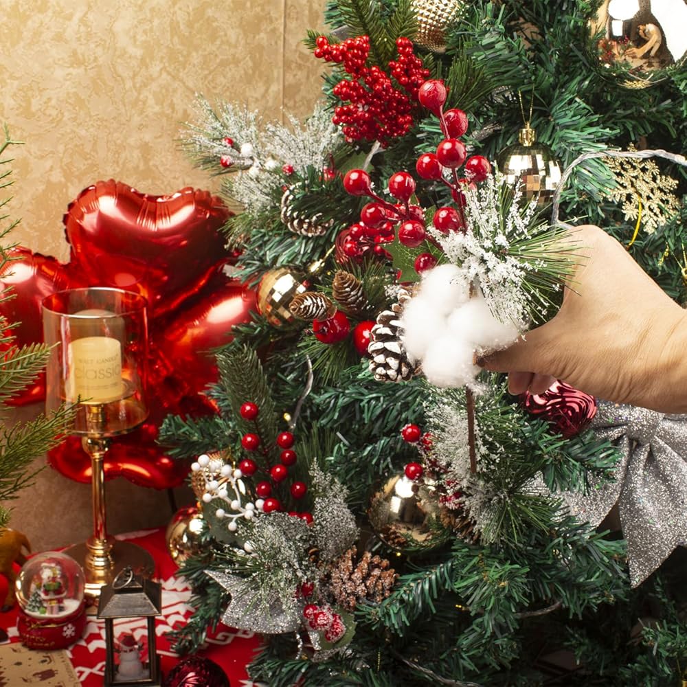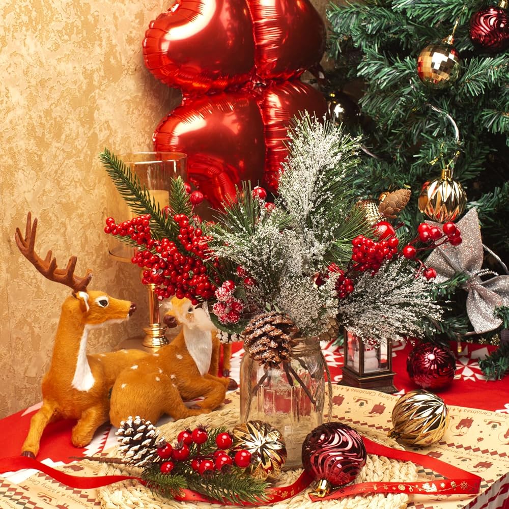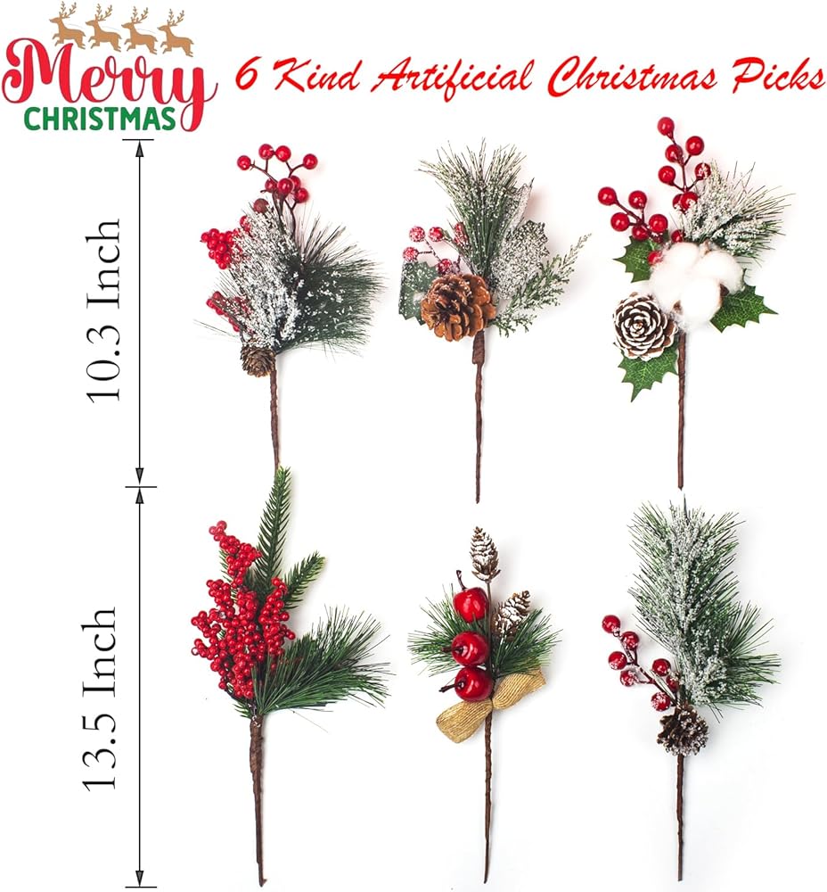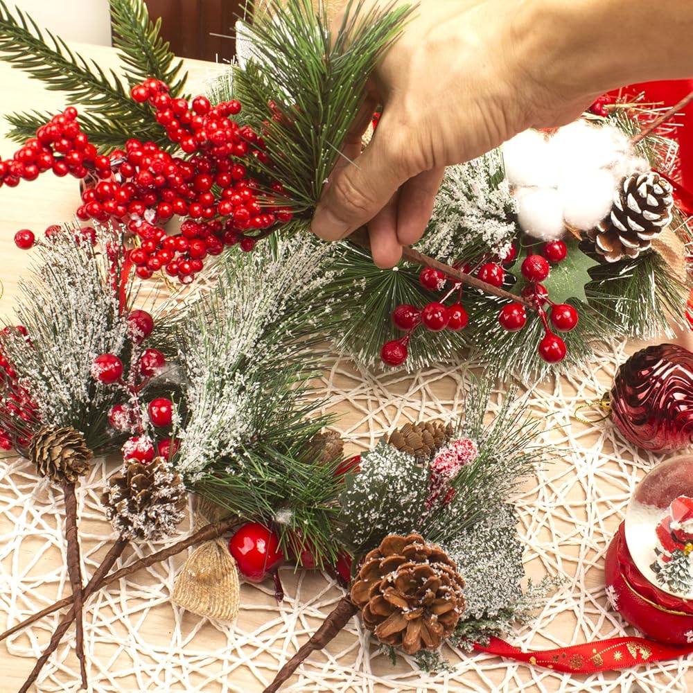 Festive Decor: This set of 6 artificial pine picks, adorned with vibrant red berries, pinecones, and lush greenery, adds a touch of holiday cheer to any space.