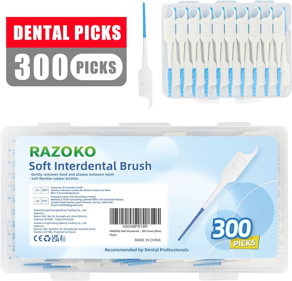 فرش ريزوكو الناعمة بين الأسنان الأصلية، أدوات تنظيف الأسنان لتنظيف الأسنان، فرش بين الأسنان للاستعمال مرة واحدة، مع حقيبة حمل مريحة (أزرق، عدد 300)