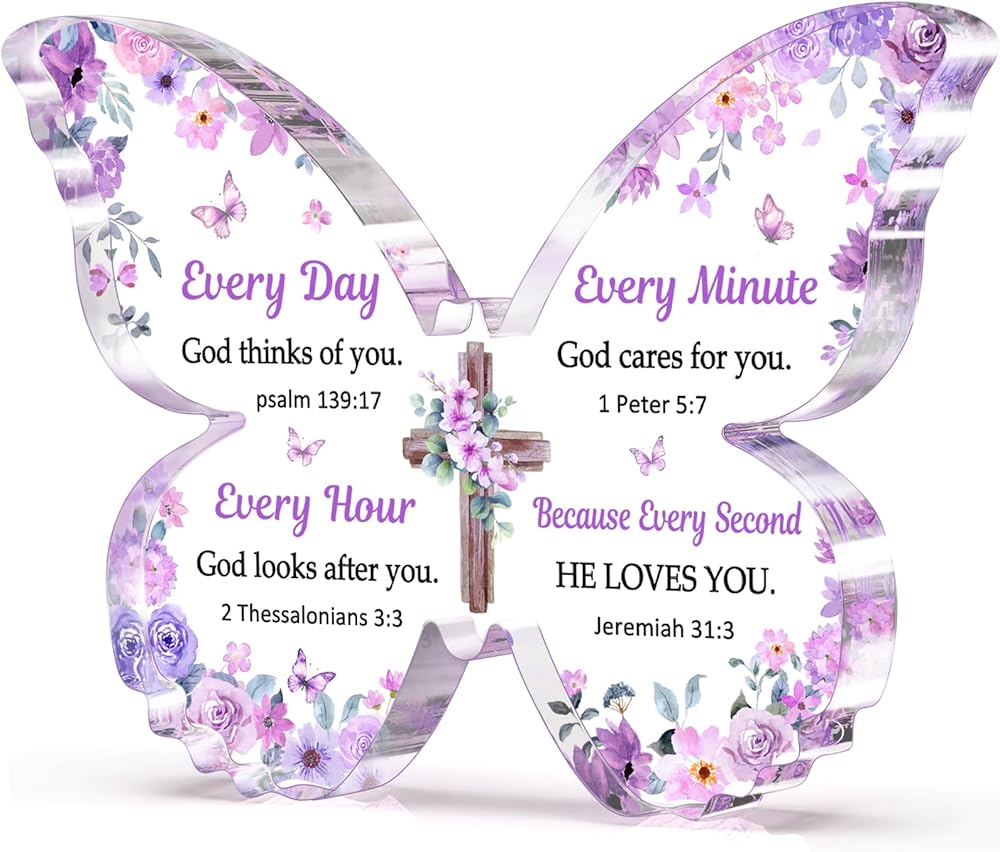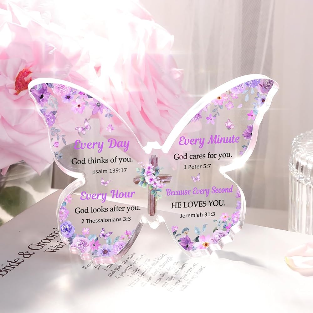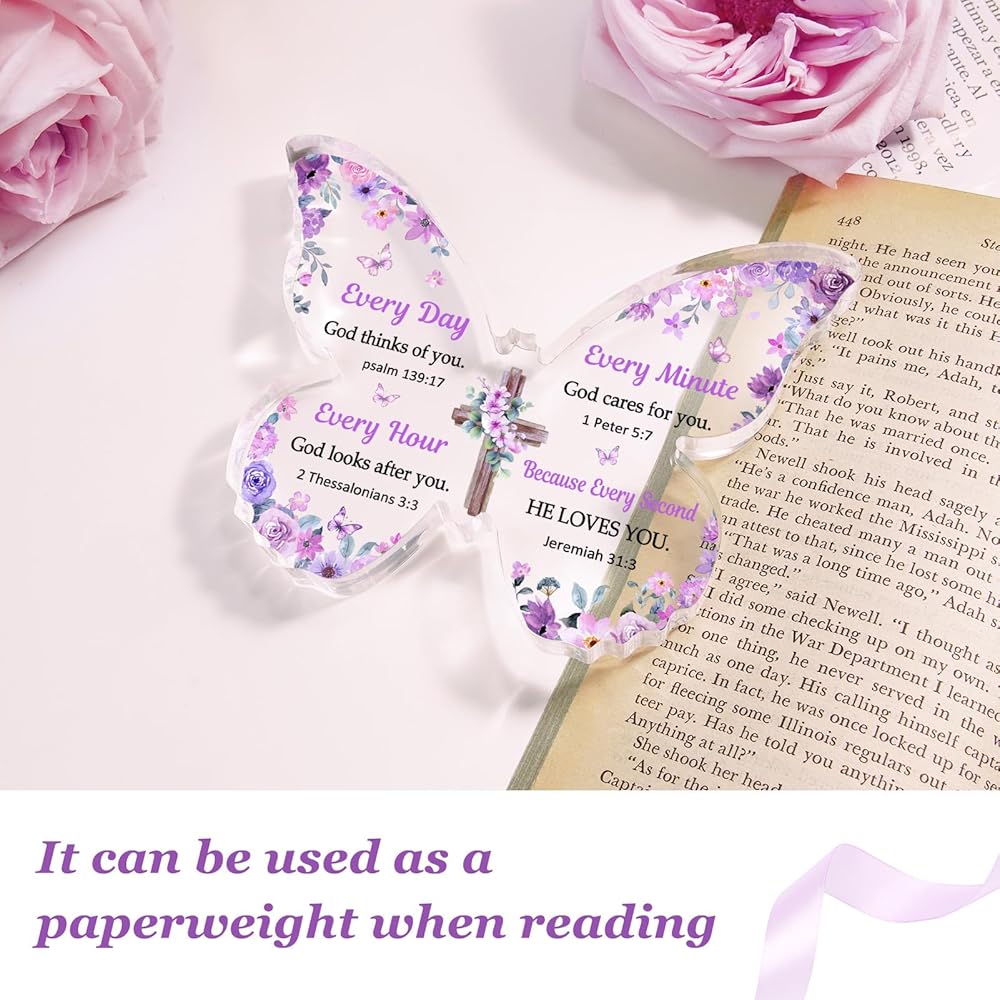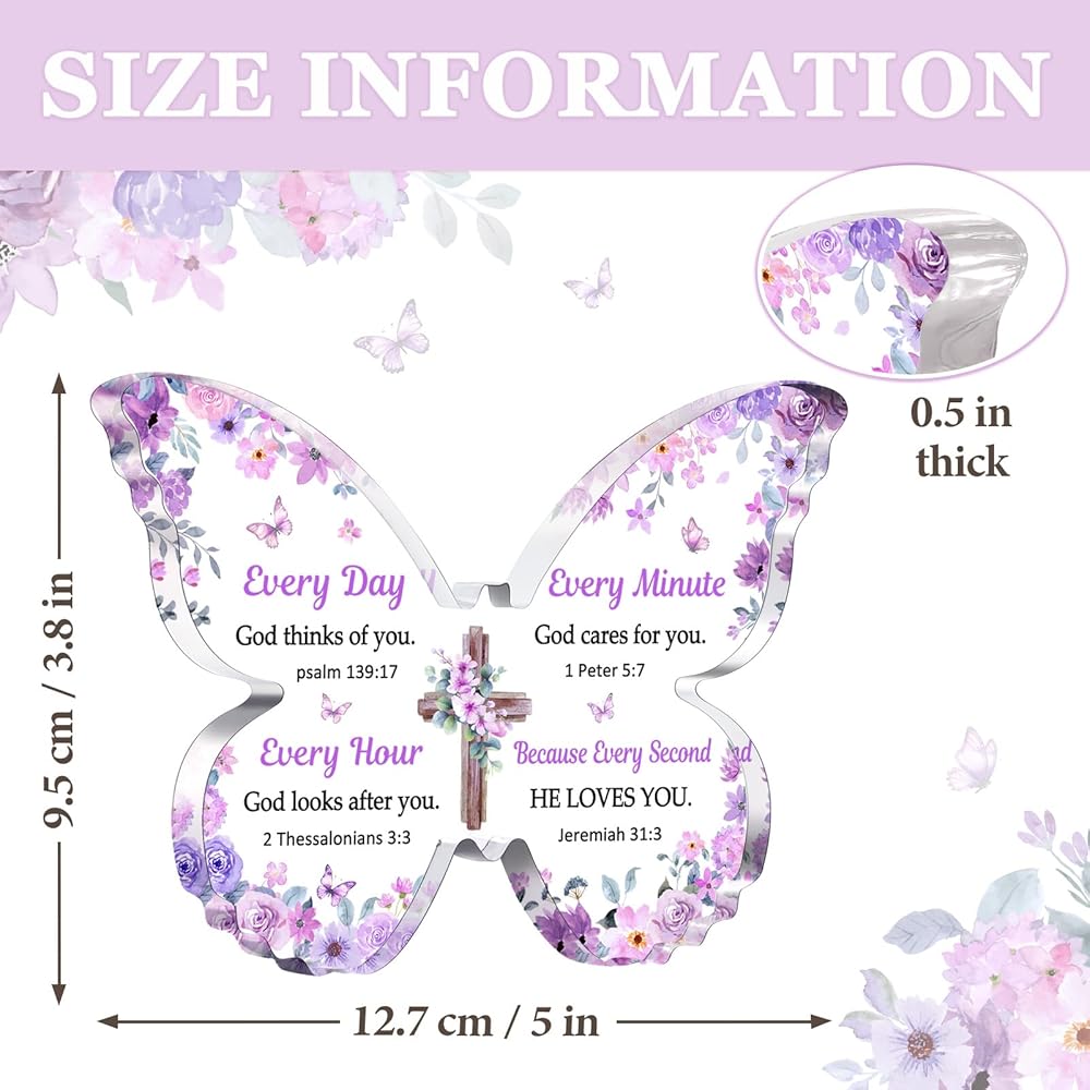 【مادة عالية الجودة】الهدية المسيحية على شكل فراشة مصنوعة من الأكريليك عالي الجودة، وهو شفاف تمامًا تحت الضوء. تمت طباعة النص والنمط بتقنية الأشعة فوق البنفسجية، تمامًا مثل الفراشة الحية التي تطير بين الزهور.