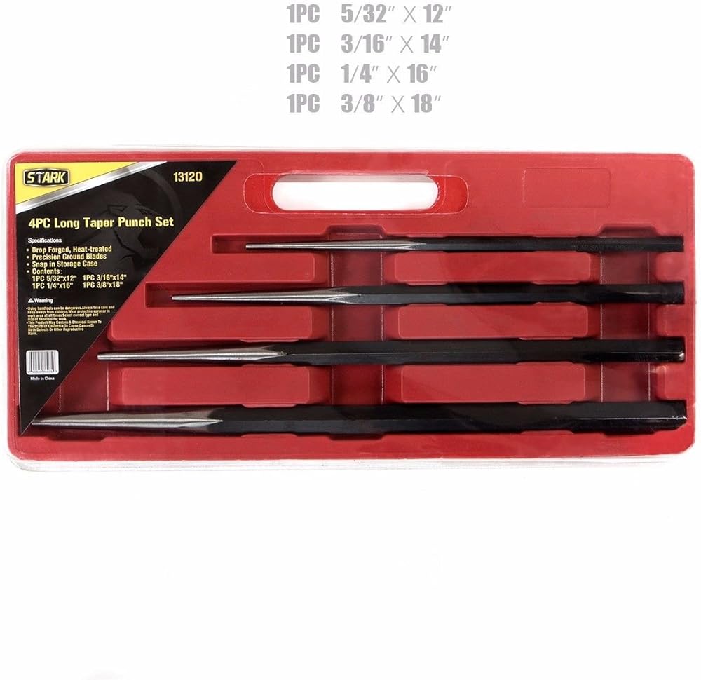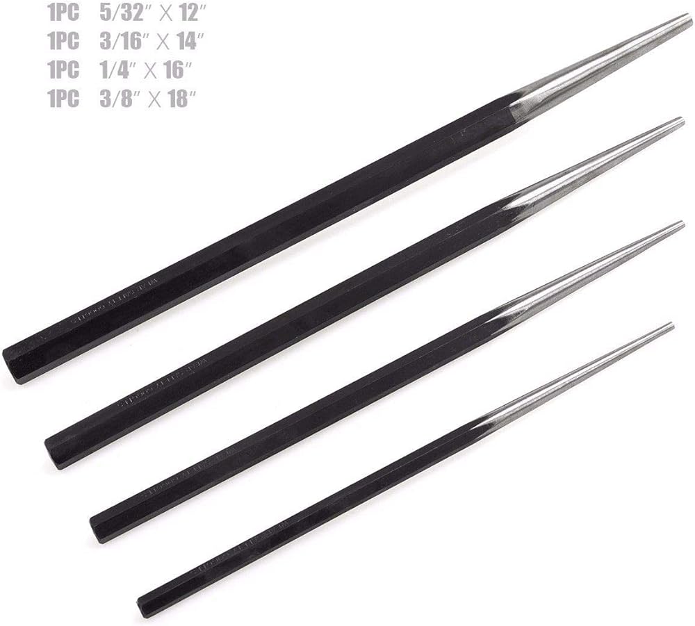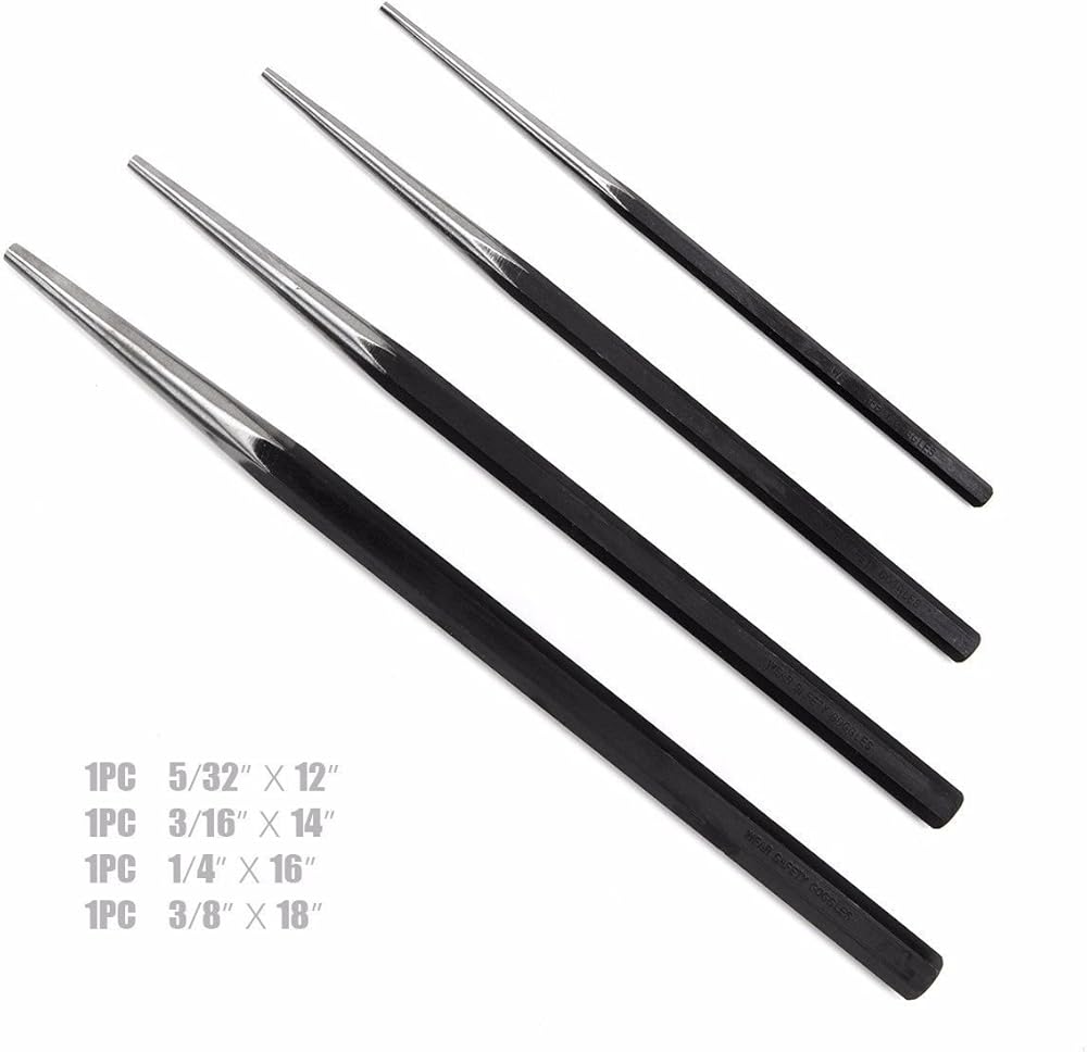 طويلة للغاية - توفر هذه اللكمات، الكبيرة في الطول، قوة إضافية ووصولاً ممتدًا من خلال القطع السميكة أو العوائق السابقة وتوفر مساحة للقبضة باليدين عند الحاجة؛ محتوى العبوة: الحجم: 5/32 بوصة × 12 بوصة، 3/16 بوصة × 14 بوصة، 1/4 بوصة × 16 بوصة، 3/8 بوصة × 18 بوصة
