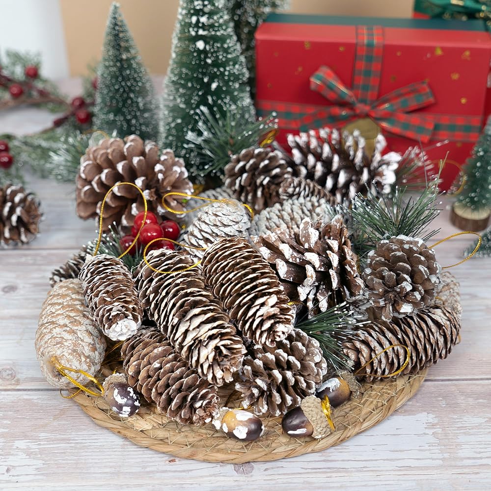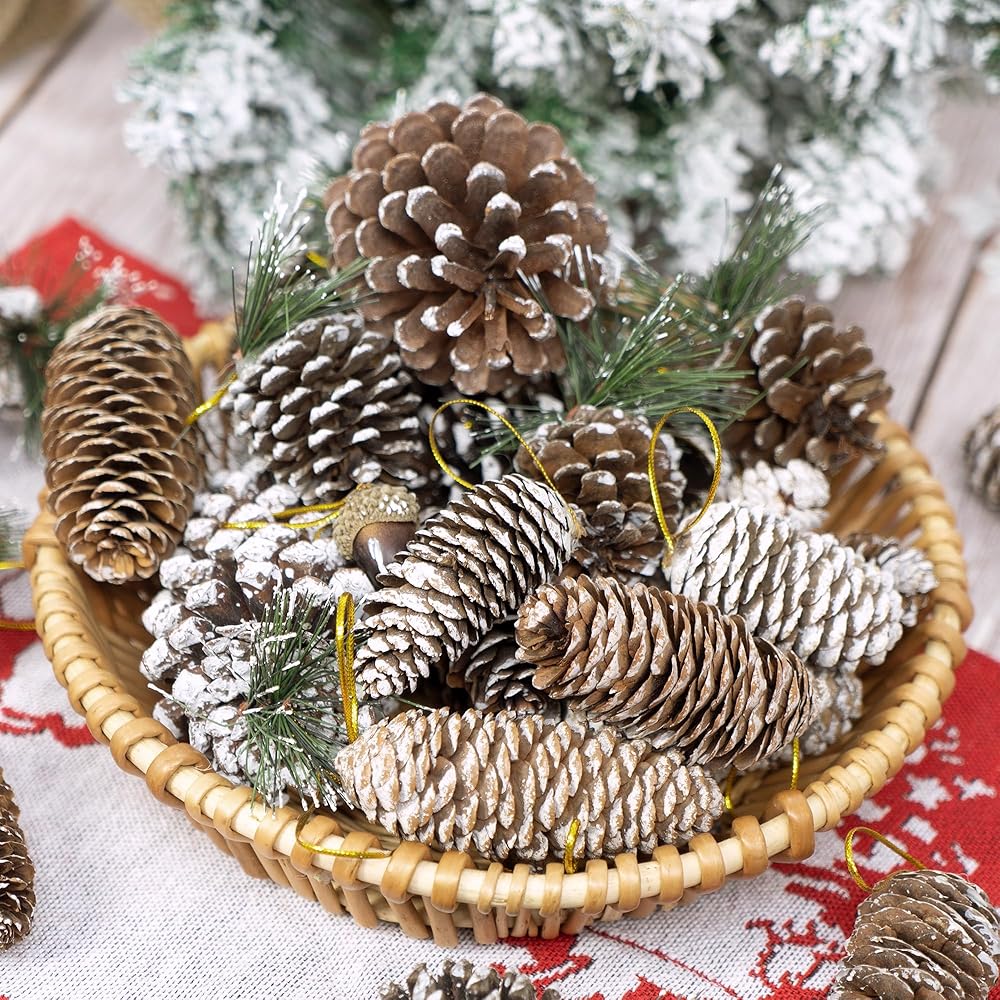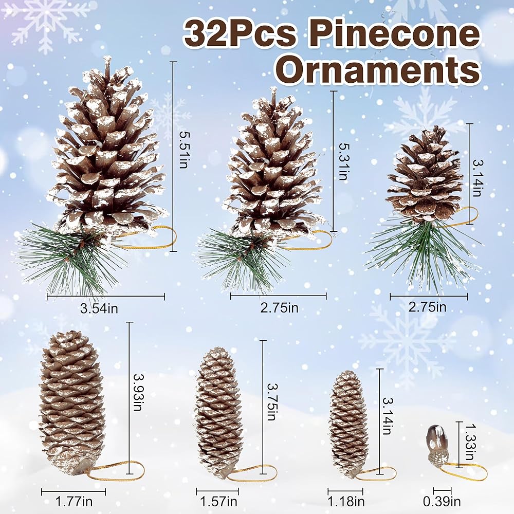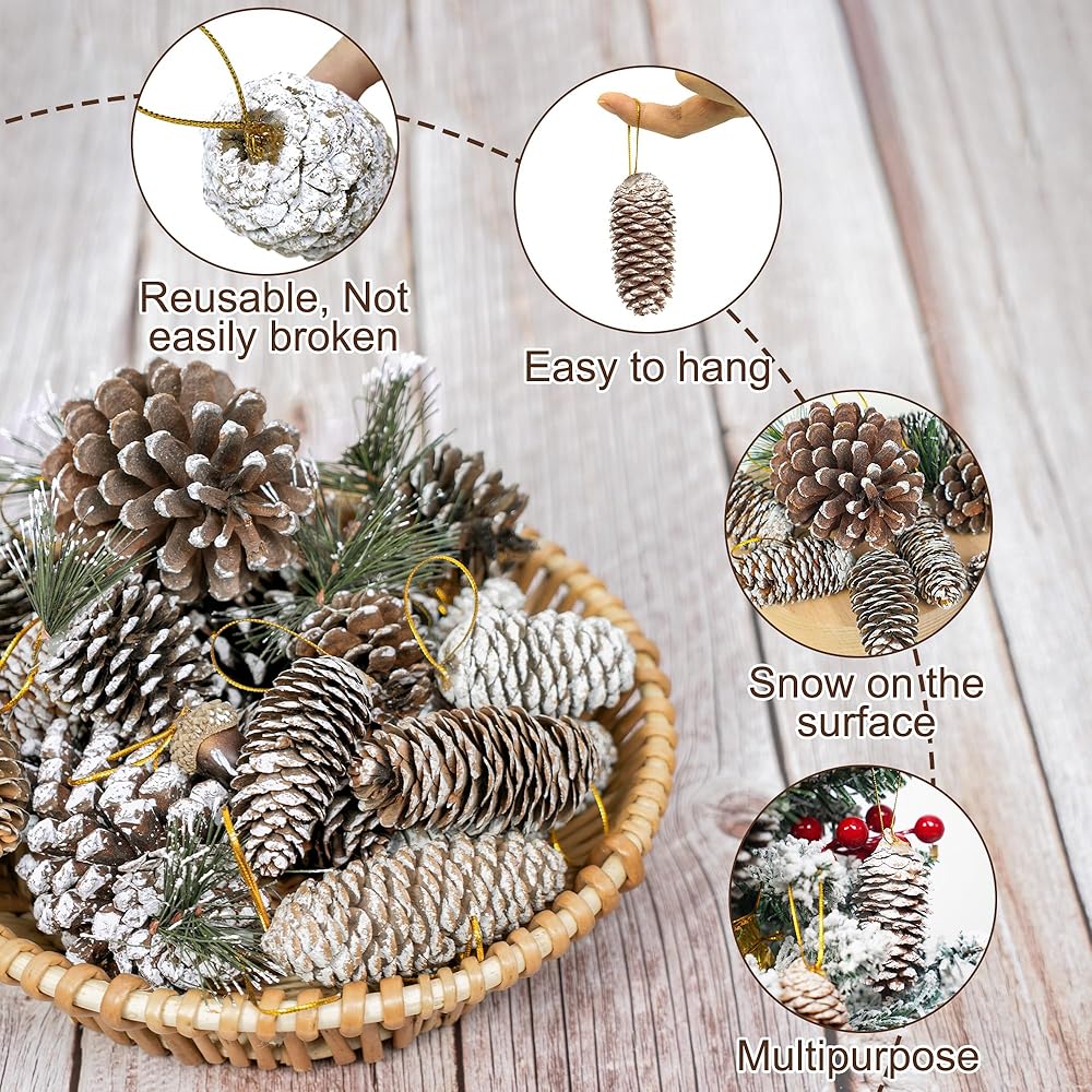 • Package Includes: Christmas decorations include 32 natural pine cones with snow; There are four types of Christmas pine cones, among which American pine cones and Pinus tabulaeformis pine cones all have green pine branches