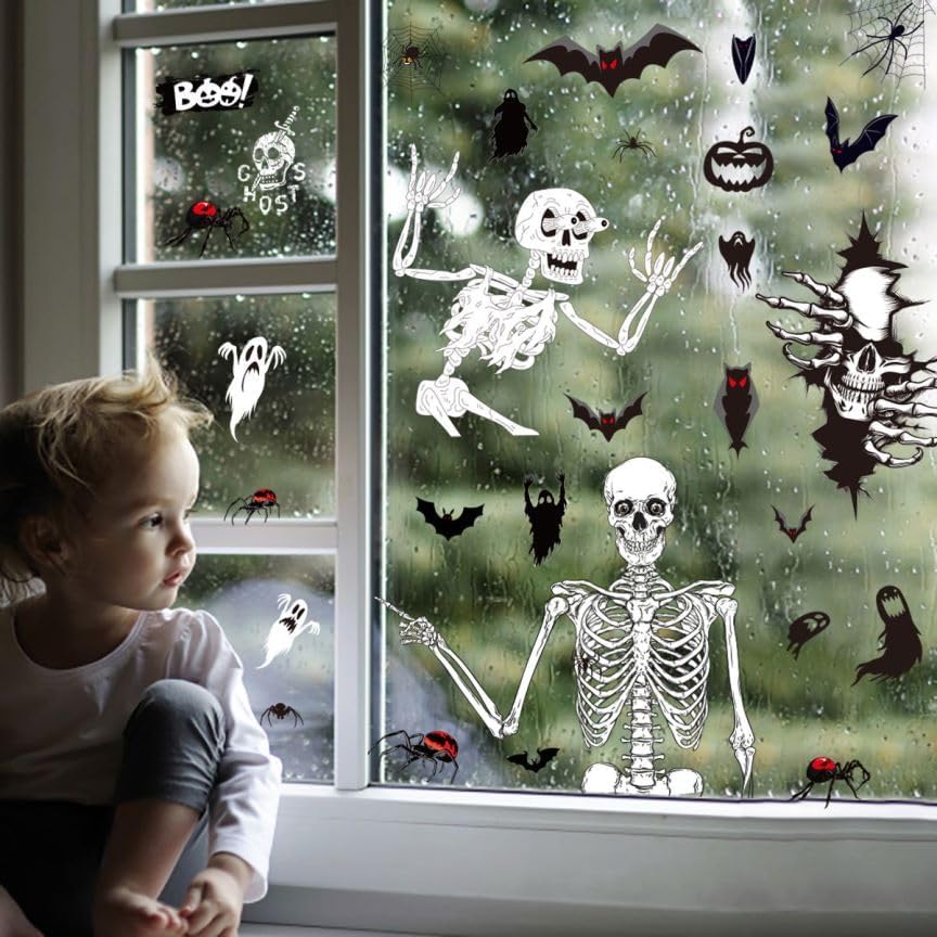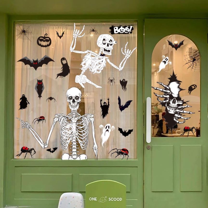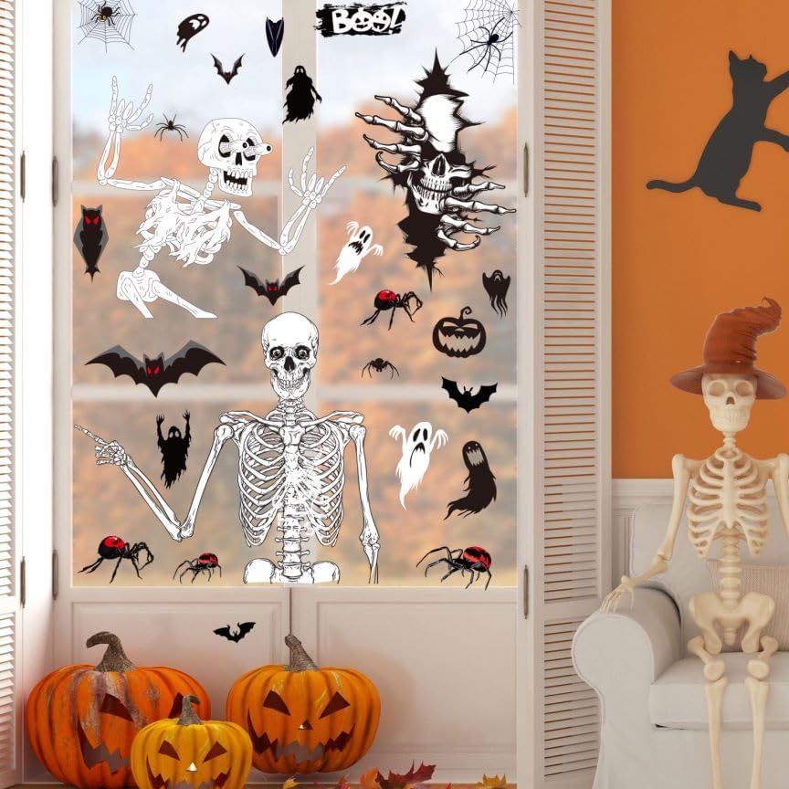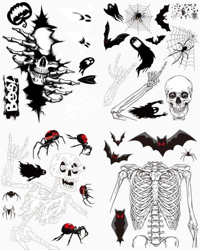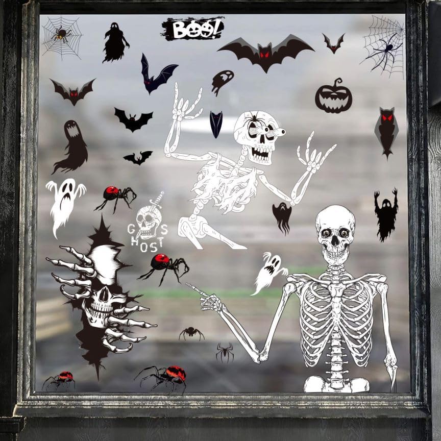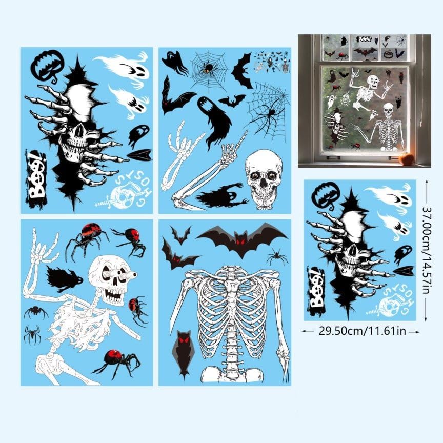 Products Included : 4 sheets large scary skulls bats spiders ghosts Halloween window stickers, totally 34pcs. Each sheet measures 11.61in×14.57in(29.5×37CM).