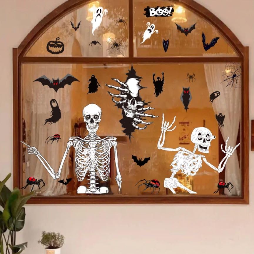 Horror Halloween Elements : This series of Halloween window decorations combines the most classic elements of Halloween, with skulls representing death and rebirth, bats symbolizing darkness and mystery, spiders and spider webs adding a touch of gloom, and ghosts evoking associations with the supernatural world. These elements together create a Halloween atmosphere that is both terrifying and exciting.