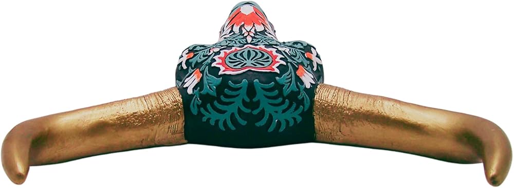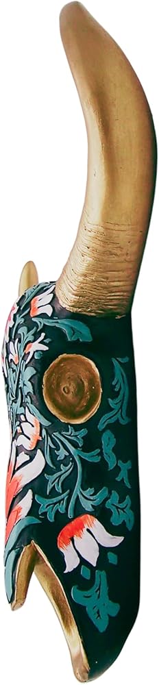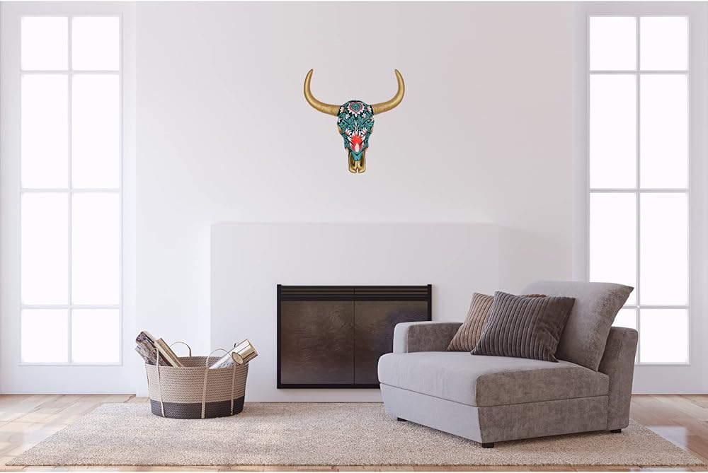 - لوحة فنية جدارية تتميز بجمجمة بقرة قبلية بتصميم فيروزي جميل وأبواق ذهبية اللون