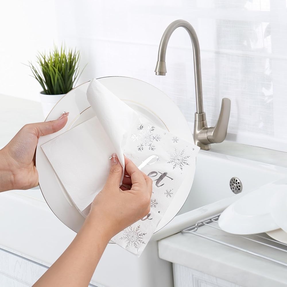 • 【Convenient to Use】Disposable snowflake dinner napkins are easy to carry and store. Disposable products, throw them directly into the trash can after use, freeing your hands and saving time to accompany your family.
